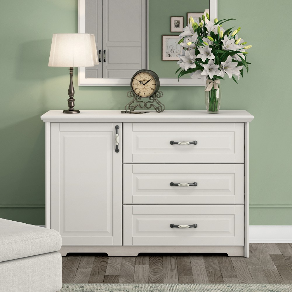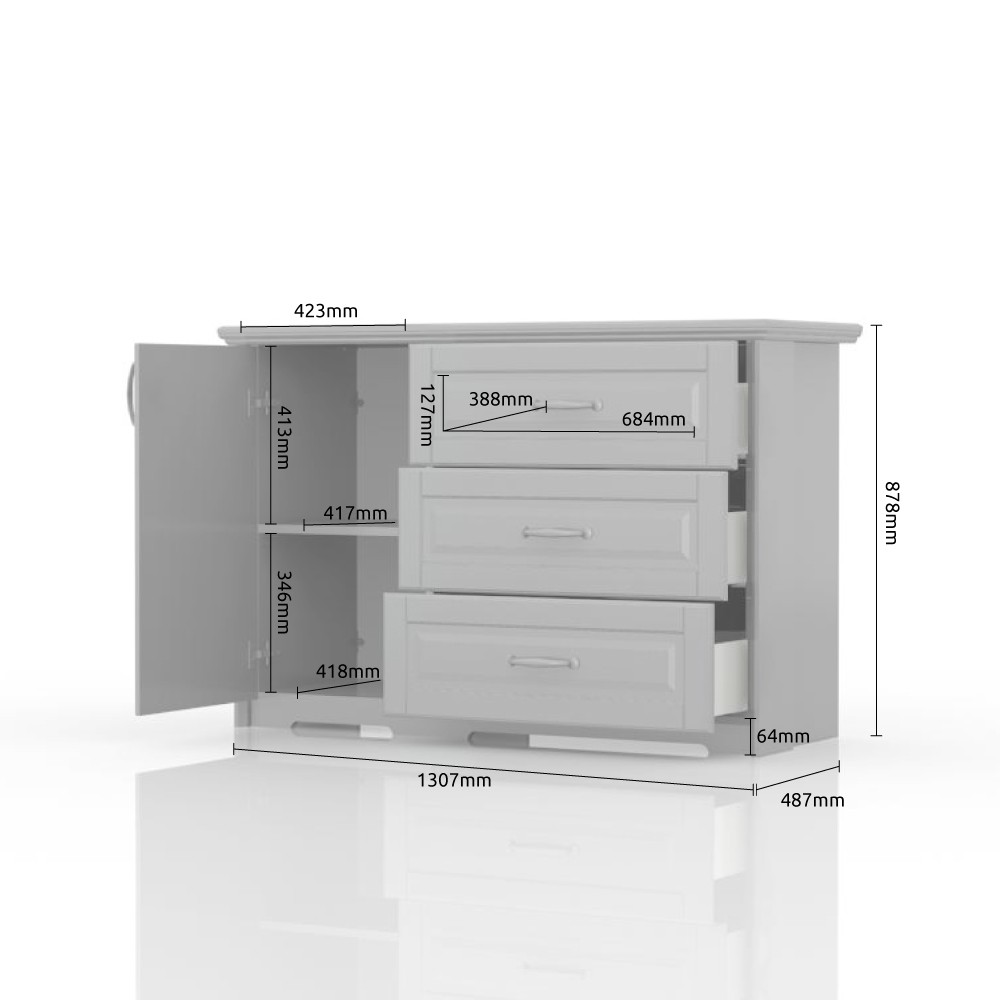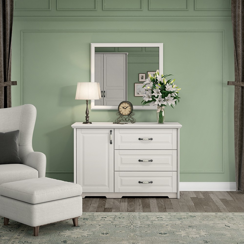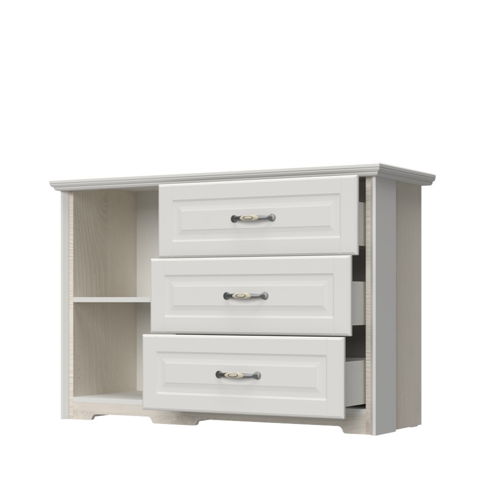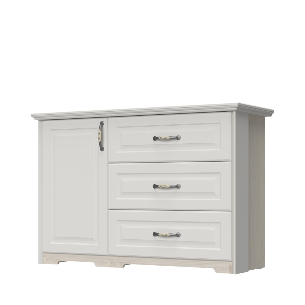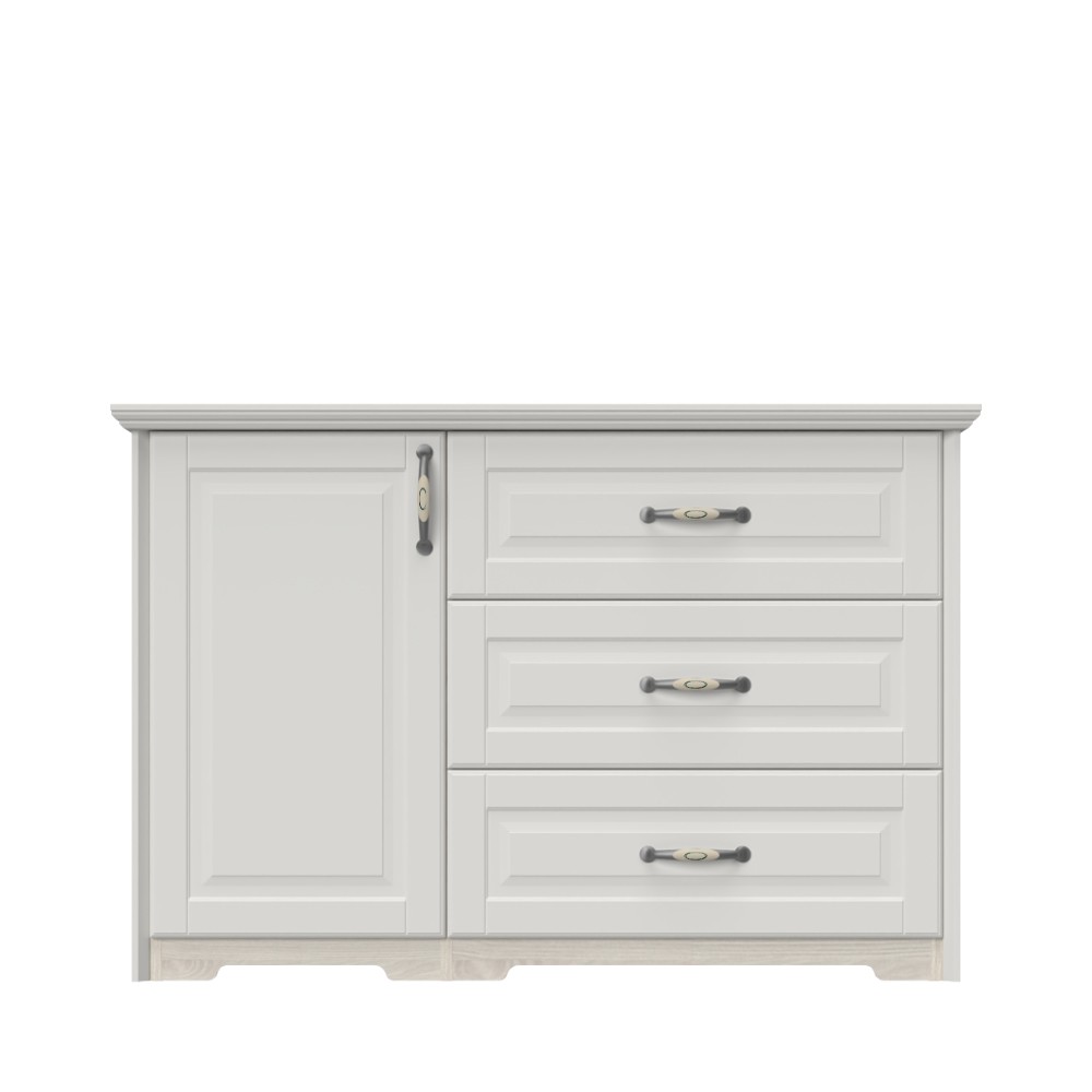 Rustikalna, elegantna i funkcionalna komoda za odlaganje odjeće. Komoda za spavaću sobu ima jedno krilo koje je uvijek na lijevoj strani elementa i tri ladice. Profilirane fronte i ukrasna pokrovna ploča izrađeni su od medijapana lakiranog UV lakom s nježnim mat efektom u boji slonova kost. Dizajn elementa zaokružuju ukrasne lajsne debljine 25 mm. Korpus je izrađen od šperploče u dekoru polarni bor. Element je kantiran i sa stražnje strane. Soft-close šarke i klizači omogućuju tiho zatvaranje ladica i krila što daje dodatnu udobnost tijekom korištenja. U cijenu elementa uključene su ukrasne ručke, jedna ladica (R-19) i niveliri koji omogućuju niveliranje na neravnim površinama.