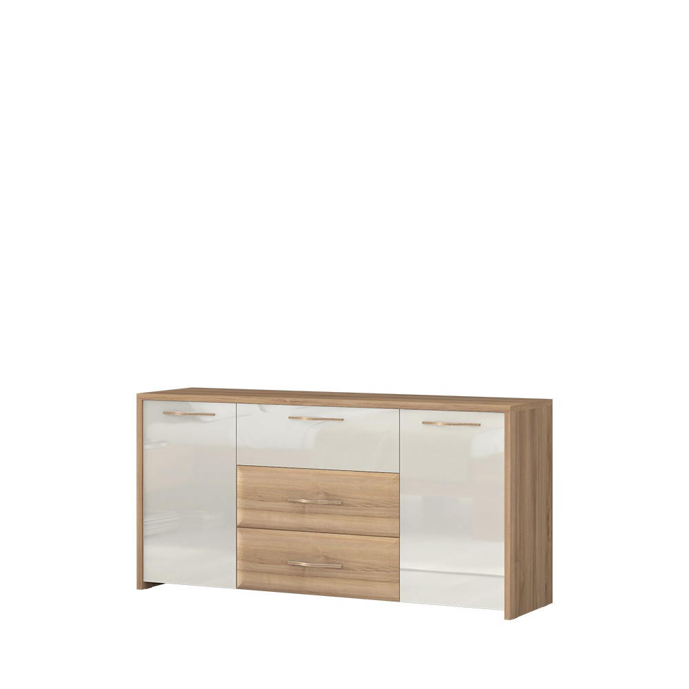 Komoda za spavaću sobu, iz kolekcije Gala, modernog dizajna sa dva krila i tri ladice. Prednji dio krila je od iverala koji je lakiran UV lakom u bež boji. Fronta gornje ladice izrađena je od iverala koji je lakiran UV lakom u bež boji, dok su fronte ostalih ladica izrađene od medijapana u dekoru pacifik orah. Korpus elementa izrađen je od šperploče u dekoru pacifik orah, ručke na ladicama i krilima su s aplikacijom u drvo dekoru. Soft-close šarke i soft-close klizači omogućuju tiho zatvaranje krila, što daje dodatnu udobnost tijekom stalne uporabe. Element sadrži dvije police, kao i podesive nogice koje omogućuju izravnavanje na neravnim površinama.