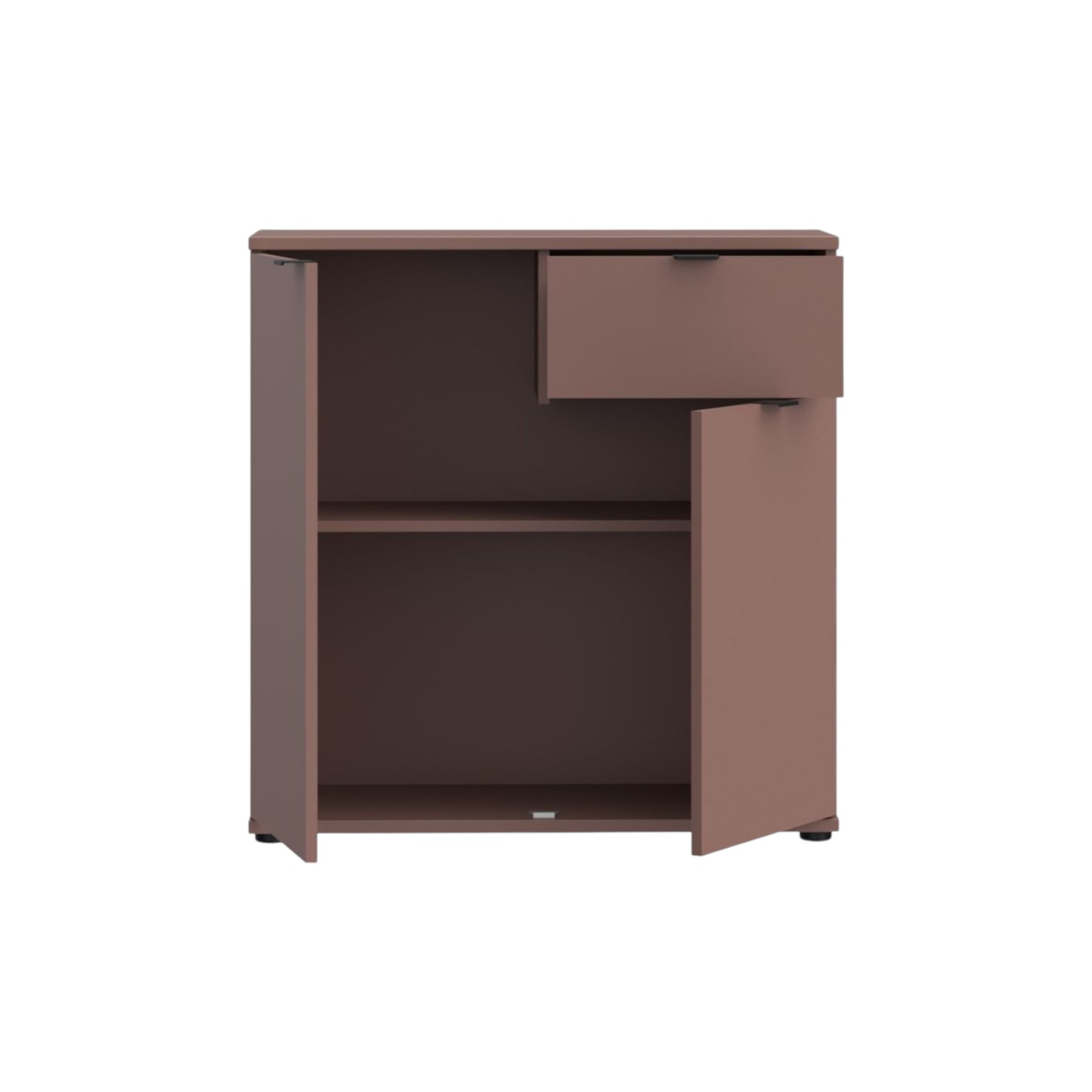 Ova kompaktna funkcionalnia komoda dostupna je u zelenoj kadulji ili crvenkastoj terakoti kako bi nadopunila širok raspon interijera. Komoda ima dvoja vrata na šarkama i jednu ladicu na vrhu, što olakšava organiziranje i spremanje raznih stvari. Unutarnji prostor podijeljen je na dva dijela s jednom policom, za dodatno iskorištenje prostora pri odlaganju raznih stvari i nosivosti do 15 kg. Mala ladica na vrhu, nosivosti do 5 kg, savršena je za manje predmete koji moraju biti uredno pospremljeni, ali i lako dostupni.