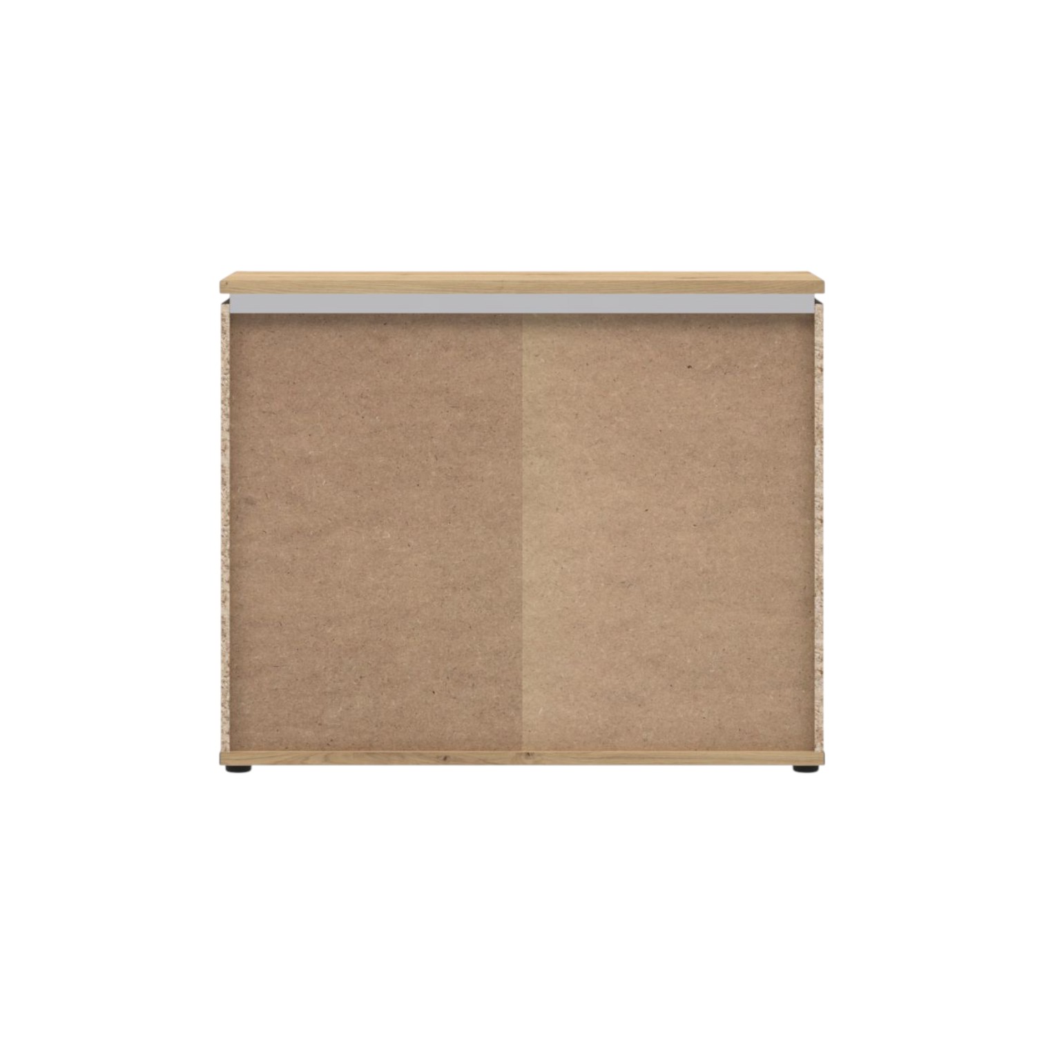 Ova komoda s tri ladice kombinira modernu funkcionalnost s prirodnim izgledom hrastovine. Crni detalji, uključujući tanke vodoravne ručke, pružaju upečatljiv kontrast boja koji poboljšava estetiku. Svaka od tri prostrane ladice ima 93 cm širine i 34 cm dubine.