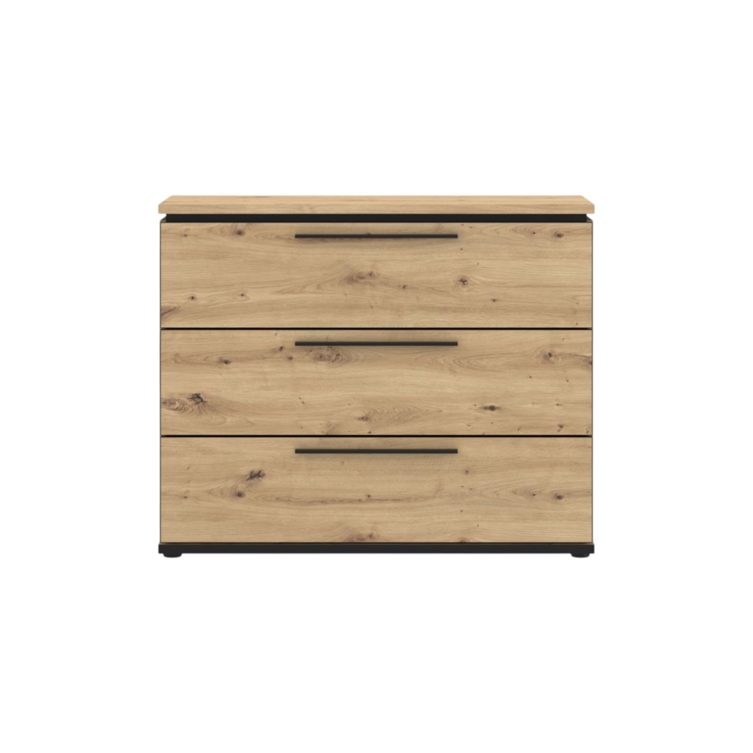 Komoda s tri ladice jednake veličine, dostupna u hrastovoj boji s crnim detaljima.