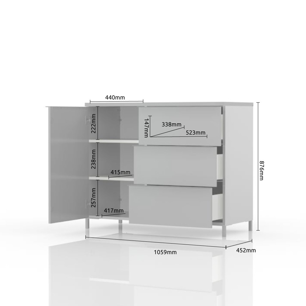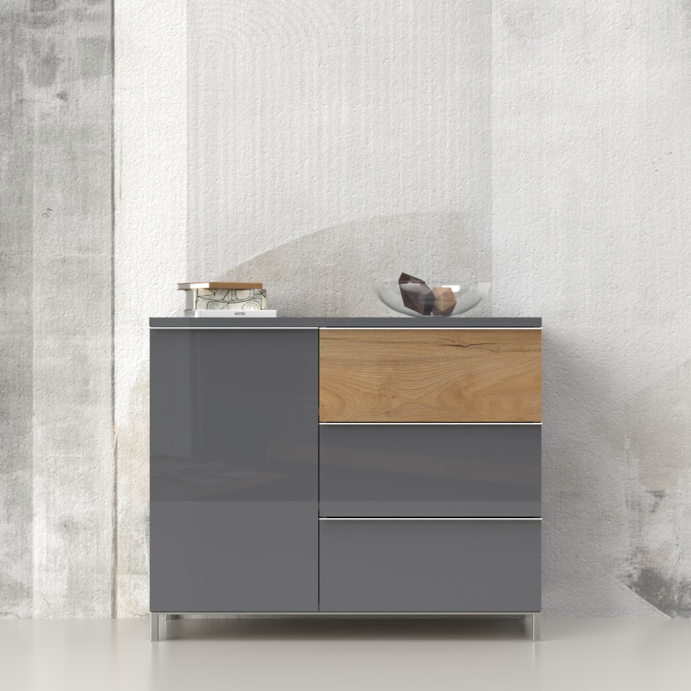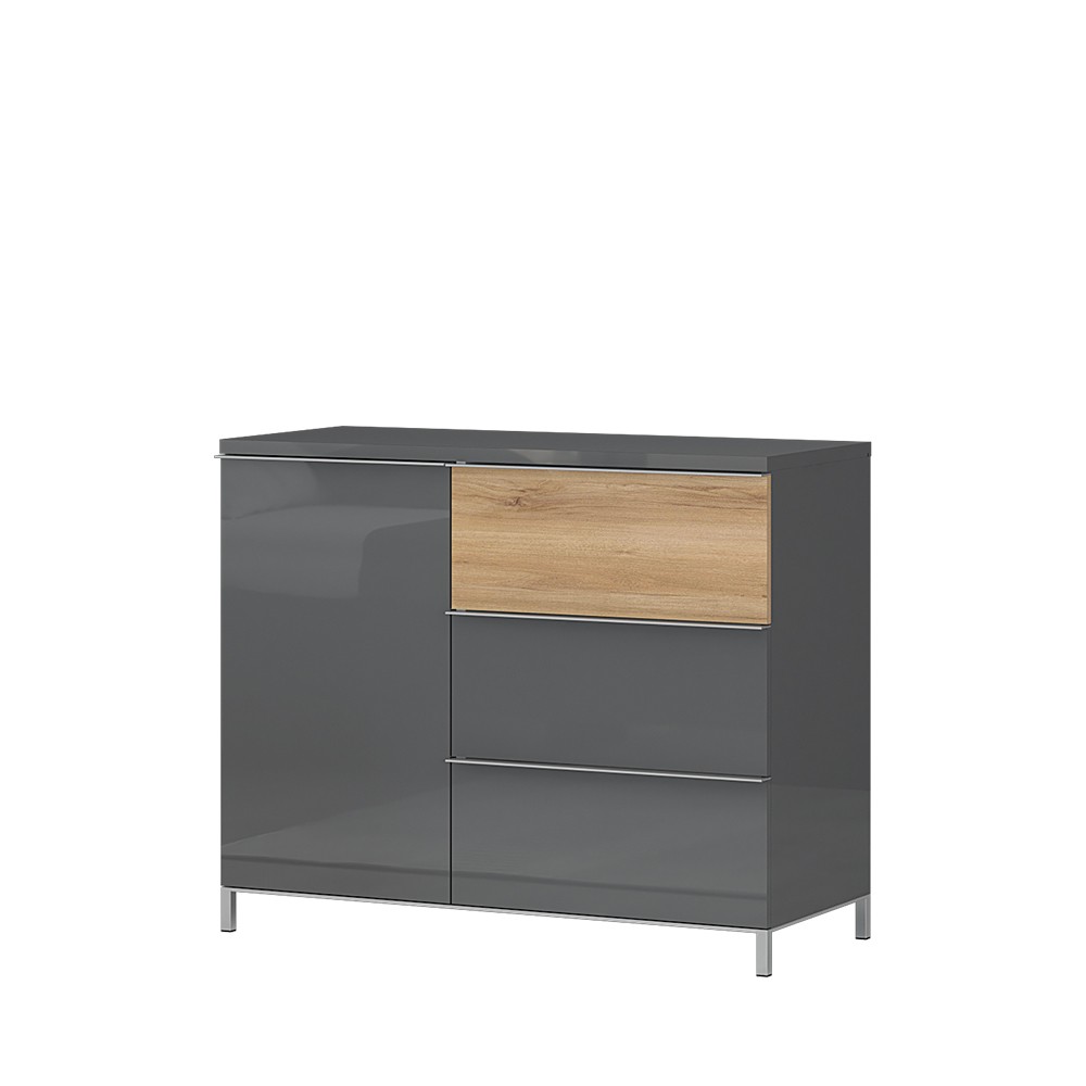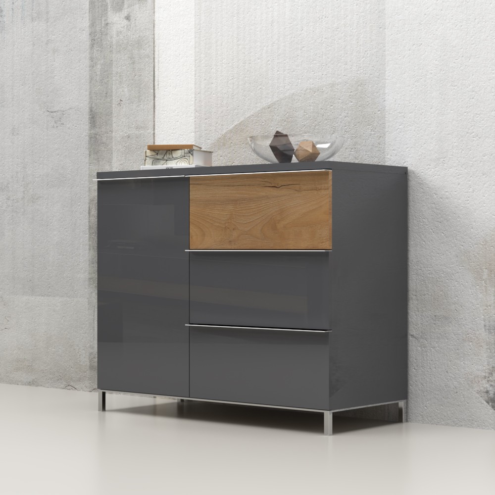 Funkcionalna komoda s jednim krilom i tri ladice, modernog dizajna i minimalističke forme. Vidljivi dijelovi komode lakirani su UV lakom visokog sjaja u artaktivnoj antracit boji. Jedna fronta ladice je u dekoru drva pacifik orah, lakirana UV lakom u visokom sjaju. Unutarnji dijelovi korpusa su u toplom tekstilnom dekoru. Soft-close šarke omogućuju tiho zatvaranje krila, što pruža dodatnu udobnost tijekom stalne uporabe. Klizni ladice s mekim zatvaranjem smanjuju trenje tijekom uporabe, imaju veću otpornost na trošenje i habanje te osiguravaju maksimalnu dugovječnost u svakodnevnoj uporabi. Dubina unutarnje strane ladica je 16 cm, što ih čini vrlo praktičnim. Unutrašnjost elementa ima dvije police koji su uključeni u cijenu elementa. Element ima kromirane elegantne nogice s okvirnom konstrukcijom i ukrasnom kromiranom ručkom.