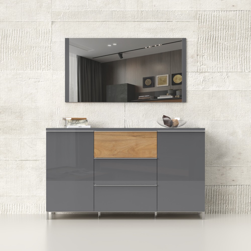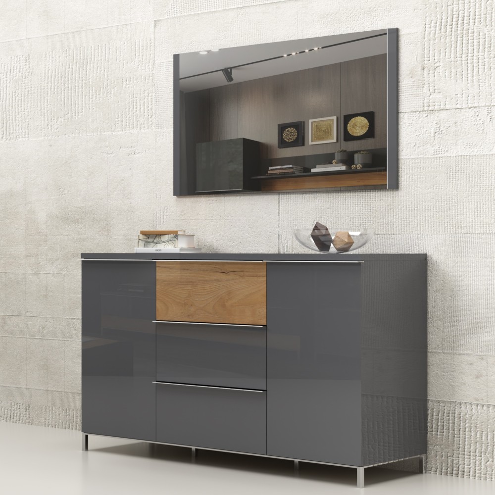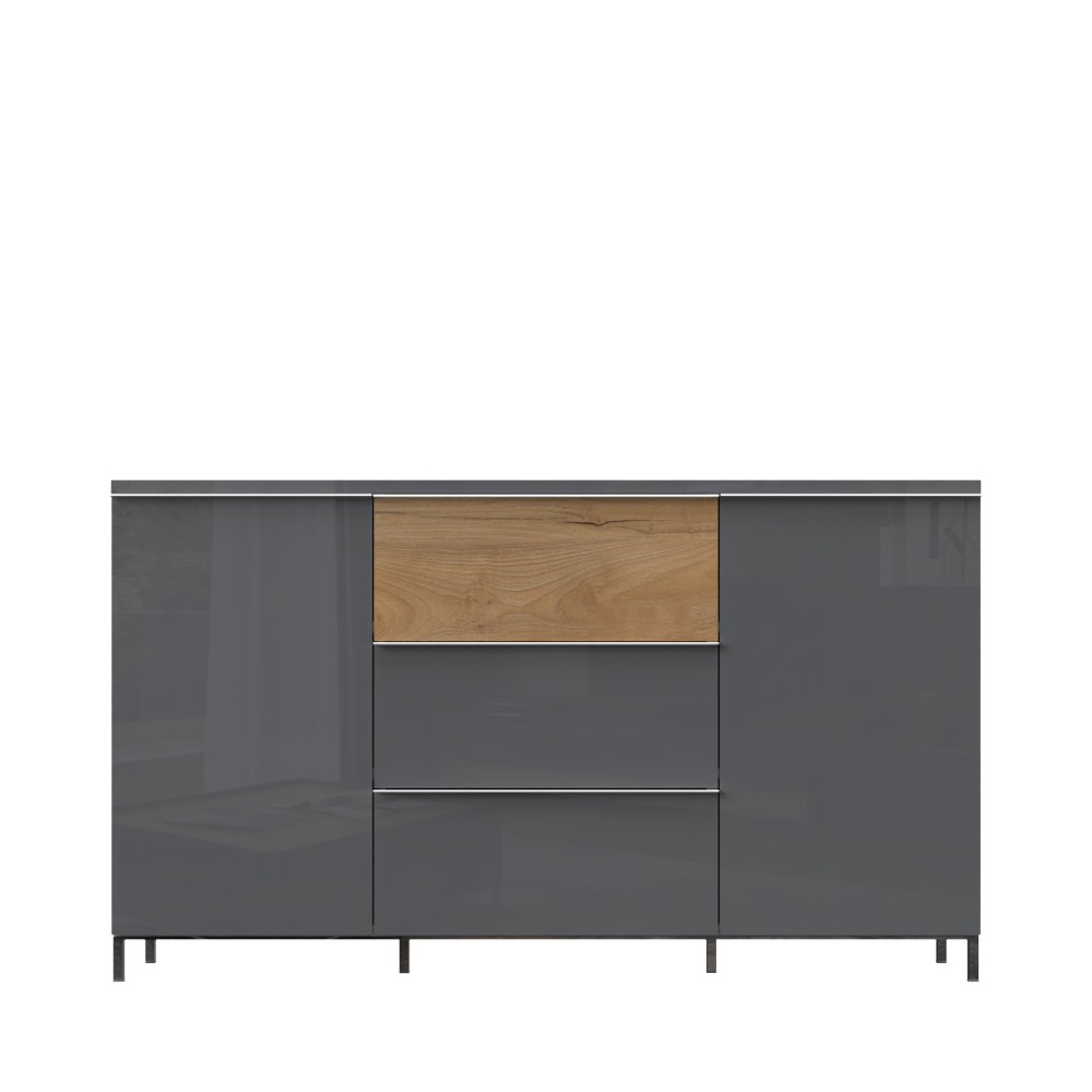Funkcionalna komoda s dva krila i tri ladice, modernog dizajna i minimalističke forme. Vidljivi dijelovi komode lakirani su UV lakom visokog sjaja u atraktivnoj antracit boji. Jedna fronta ladice je u dekoru drva pacifik orah, lakirana UV lakom u visokom sjaju. Unutarnji dijelovi korpusa su u toplom tekstilnom dekoru. Soft-close šarke omogućuju tiho zatvaranje krila, što pruža dodatnu udobnost tijekom stalne uporabe. Soft-close klizači ladica smanjuju trenje tijekom uporabe, imaju veću otpornost na trošenje i habanje te osiguravaju maksimalnu dugovječnost u svakodnevnoj uporabi. Dubina unutarnje strane ladica je 16 cm, što ih čini vrlo praktičnim. Unutrašnjost elementa ima dvije police koji su uključeni u cijenu elementa. Element ima kromirane elegantne nogice s okvirnom konstrukcijom i ukrasnom kromiranom ručkom.