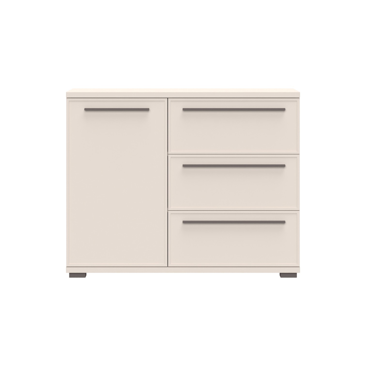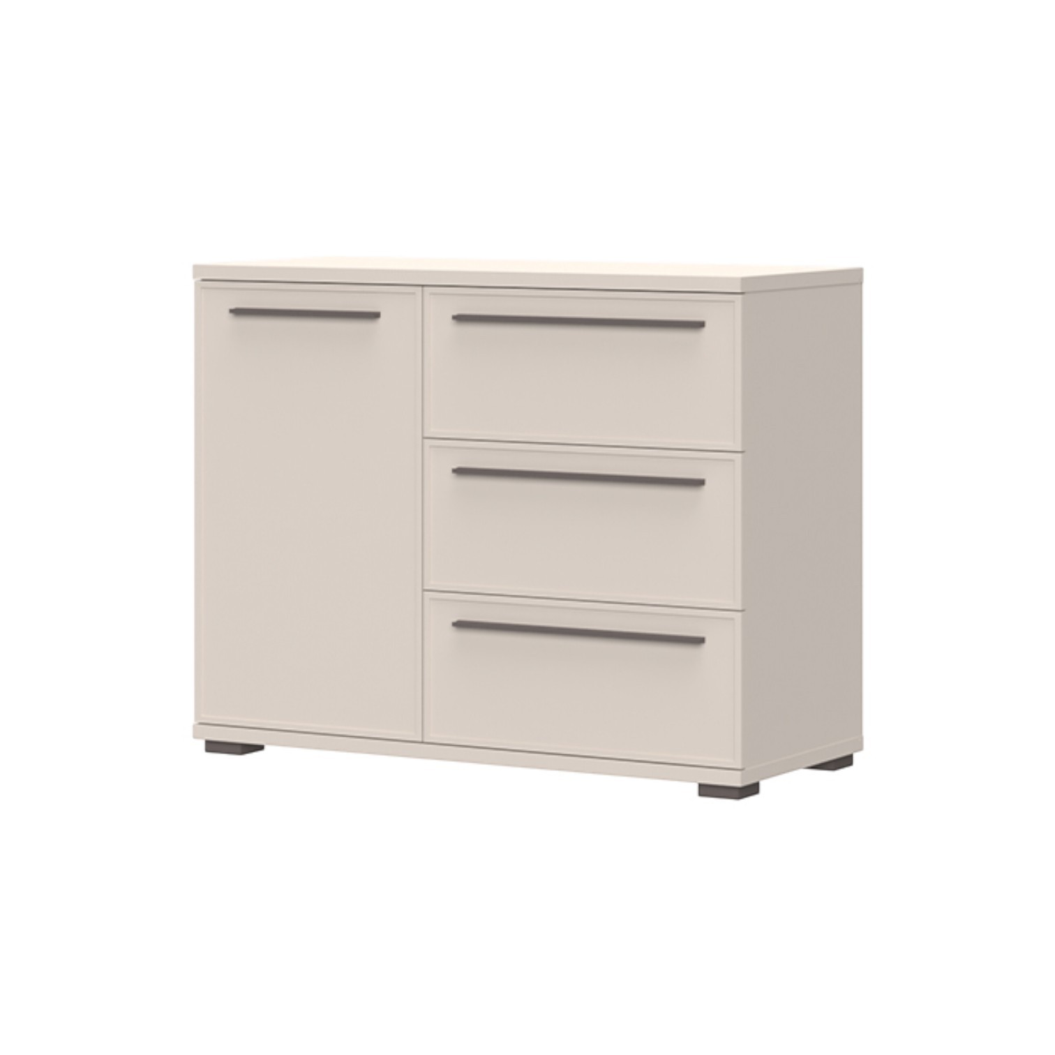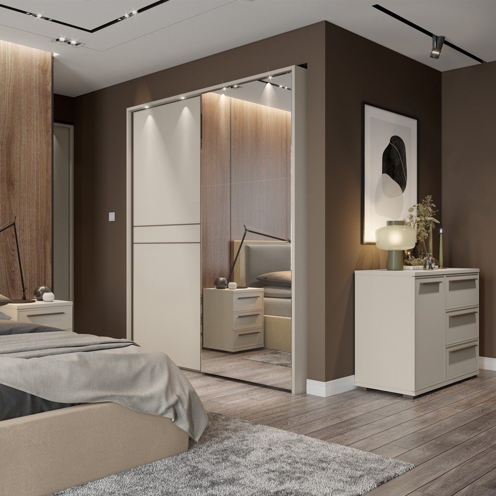 Komoda jednokrilna i tri ladice iz kolekcije Opera. Korpus i prednja strana lakirani soft mat UV lakom u boji kašmira. Unutrašnjost u textil dekoru, fronte s ukrasnim profiliranim MDF okvirom jedno krilo i tri ladice, soft-close šarke, skriveni soft-close klizači na ladicama, podesive nogice, podnica i strop debljine 25 mm, ručke u boji cortado braon mat.