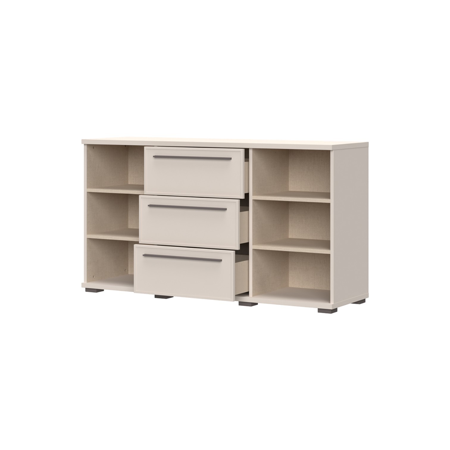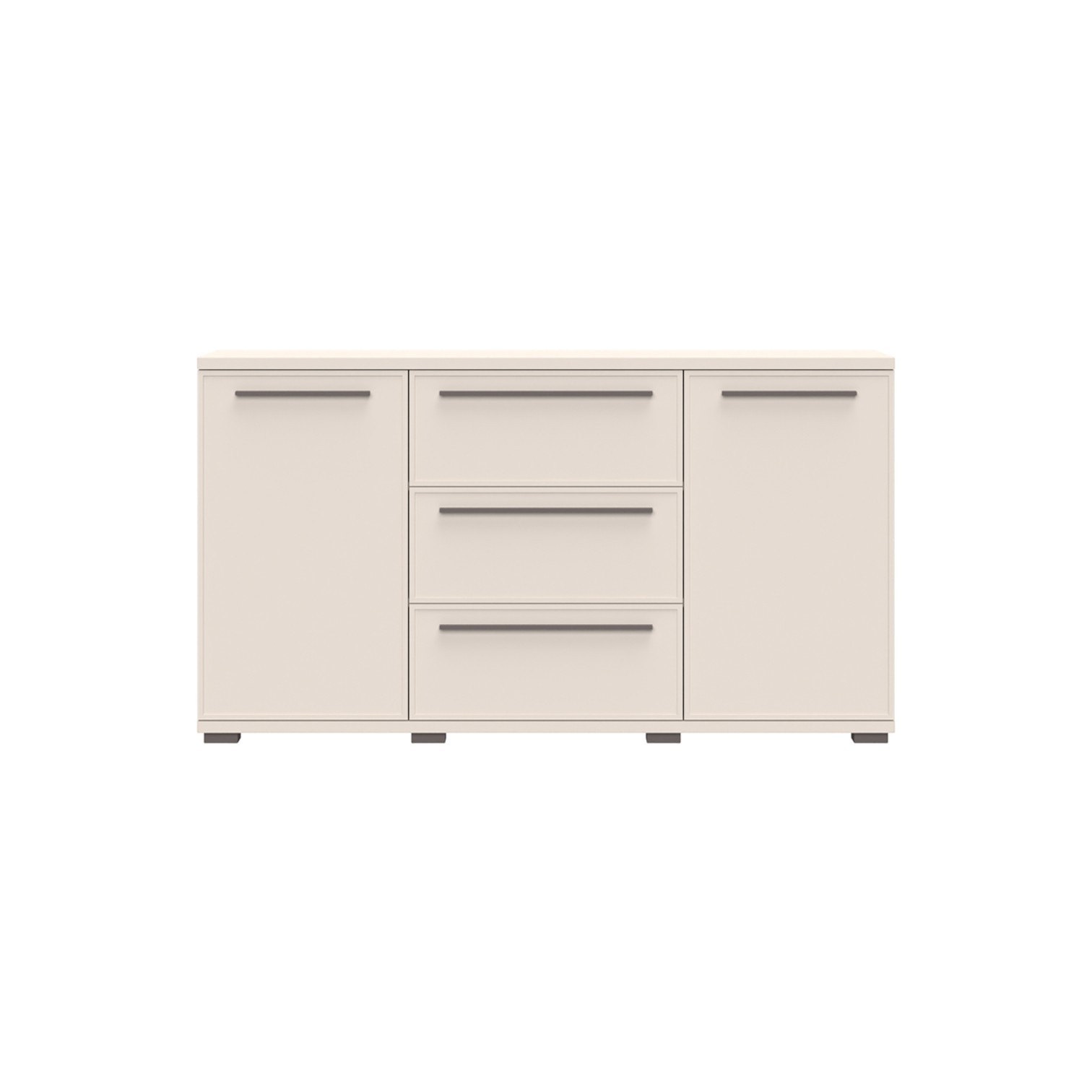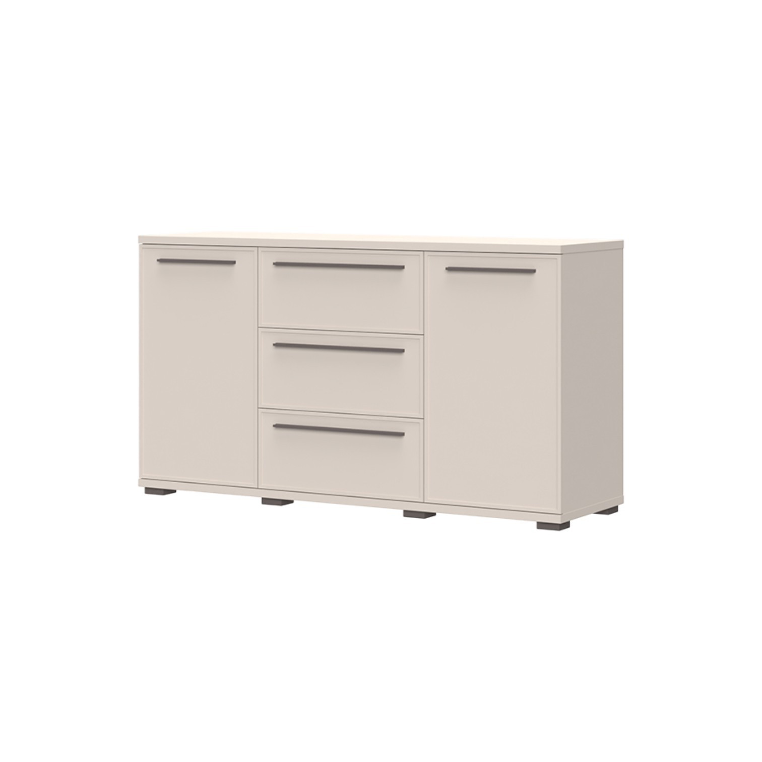 Komoda s dva krila i tri ladice iz kolekcije Opera. Korpus i prednja strana lakirani soft mat UV lakom u boji kašmira. Unutrašnjost u textil dekoru, fronte s ukrasnim profiliranim MDF okvirom, 2 krila i tri ladice, soft-close šarke, skriveni klizači soft-close na ladicama, podesive nogice, podnica i strop debljine 25mm ručke u boji cortado smeđa mat.