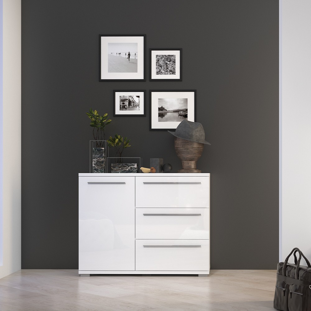 Komoda jednokrilna sa tri ladice iz kolekcije namještaja Piano. Fronte, stranice i strop elementa lakirani su UV lakom visokog sjaja, u toploj bež ili kristalno bijeloj boji. Unutarnji dijelovi korpusa su u bijeloj boji. Soft-close šarke omogućuju tiho zatvaranje krila što daje dodatnu pogodnost tijekom kontinuirane uporabe. Metalni segmenti novih klizača ladica s mekim zatvaranjem smanjuju trenje tijekom uporabe, imaju veću otpornost na habanje i osiguravaju maksimalnu dugovječnost u svakodnevnoj uporabi. Povećana dubina unutrašnjosti ladice na 16 cm, čini ih vrlo praktičnim krilo je uvijek s lijeve strane elementa. Moderna, elegantna i prije svega funkcionalna komoda za spavaću sobu.