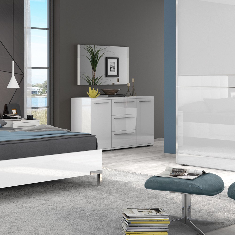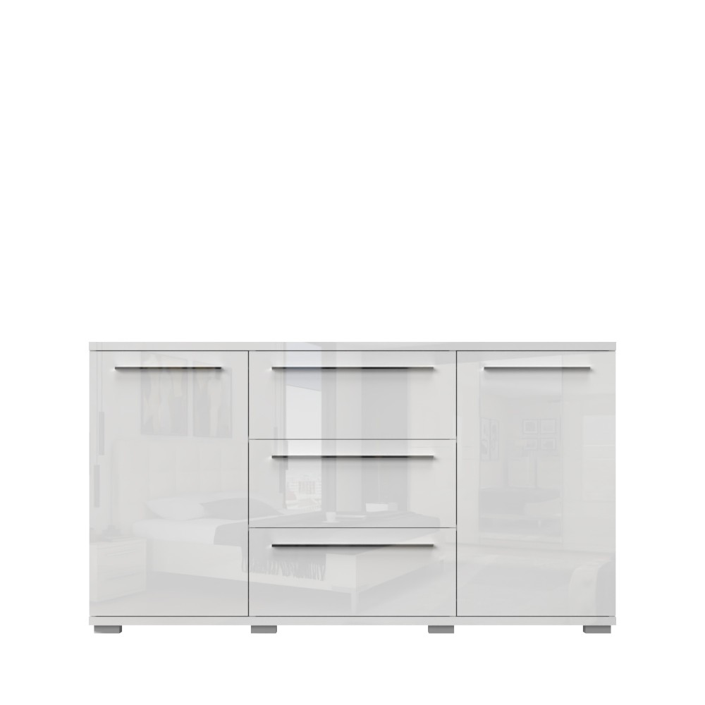 Komoda s dva krila i tri ladice iz kolekcije namještaja Piano. Fronte, stranice i strop elementa lakirani su UV lakom visokog sjaja, u toploj bež ili kristalno bijeloj boji. Unutarnji dijelovi korpusa su u bijeloj boji. Soft-close šarke omogućuju tiho zatvaranje krila što daje dodatnu pogodnost tijekom kontinuirane uporabe. Metalni segmenti novih klizača ladica s mekim zatvaranjem smanjuju trenje tijekom uporabe, imaju veću otpornost na habanje i osiguravaju maksimalnu dugovječnost u svakodnevnoj uporabi. Povećana dubina unutrašnjosti ladice na 16 cm, čini ih vrlo praktičnim. Moderna, elegantna i prije svega funkcionalna komoda za spavaću sobu.