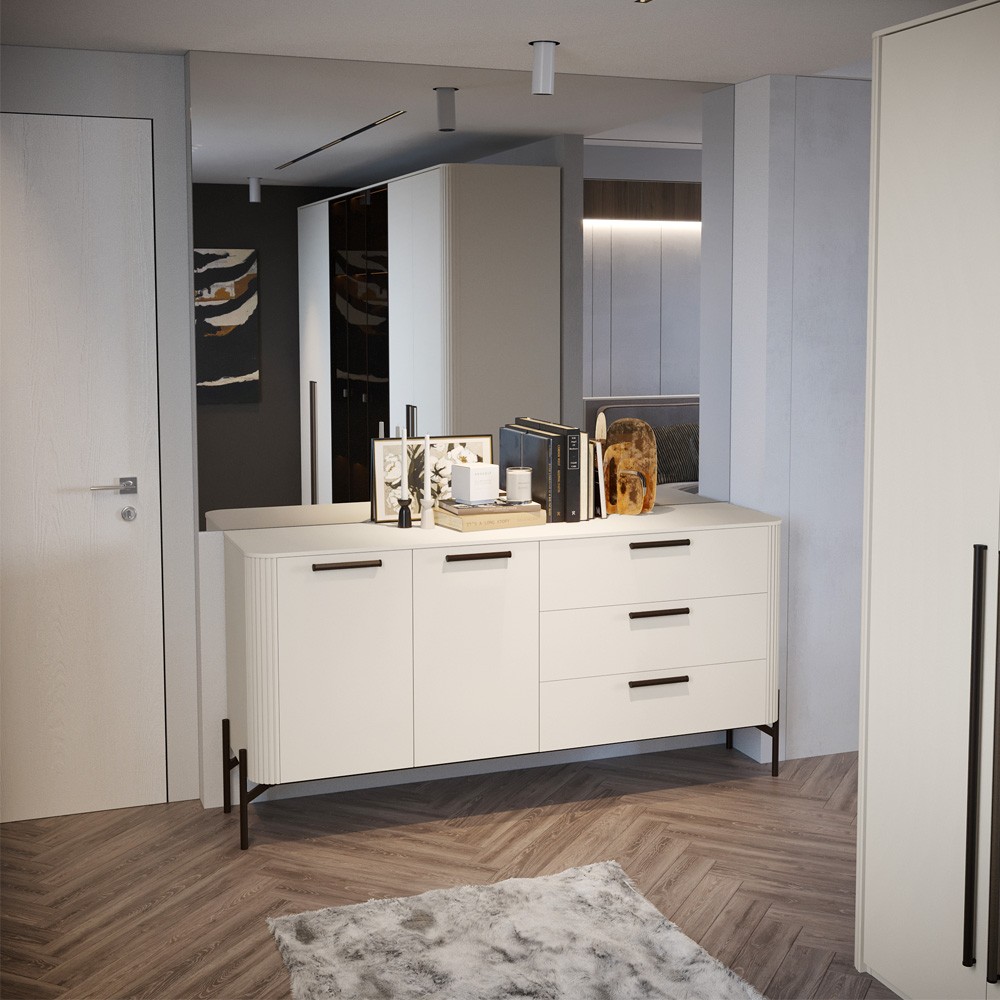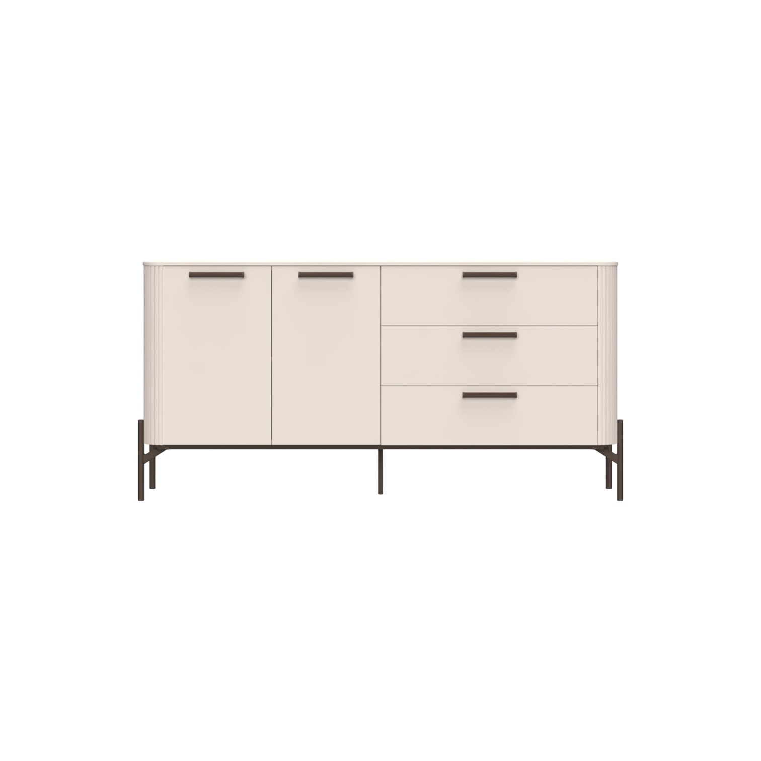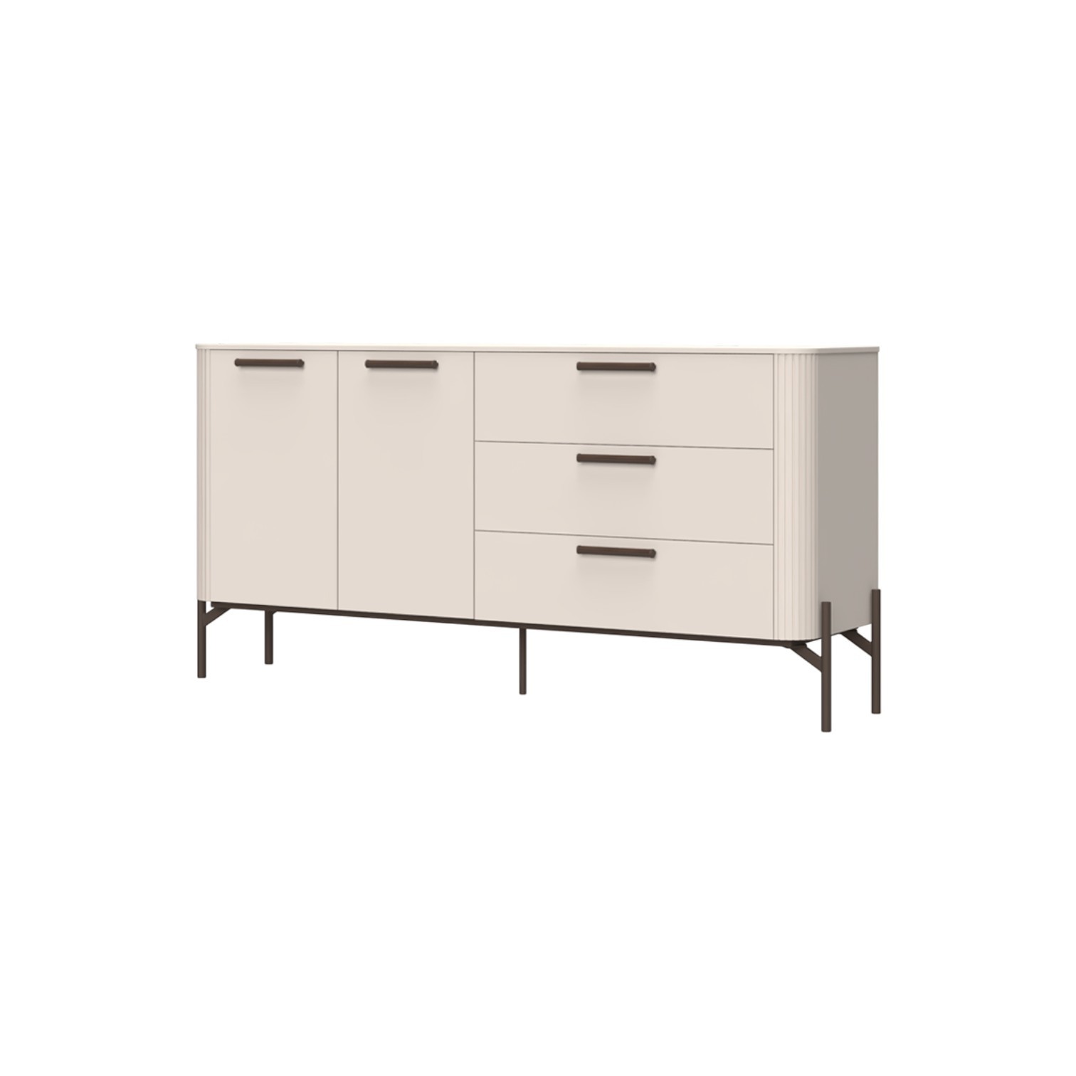 Komoda s dva krila i tri ladice, fronte lakirane UV lakom u kašmir mat dekoru. Unutrašnjost elementa u textil dekoru. Dvostruko ojačani stropni element od iverala, u kašmir mat UV lak dekoru, stranice i pod od šperploče, u dekoru kašmir mat UV lak. Ukrasni stup od MDF-a, metalne ručke u dekoru Midnight Copper, metalne nogice u dekoru Midnight Copper, metalni okvir kao osnova elementa, soft-close šarke i klizači za meko zatvaranje.
