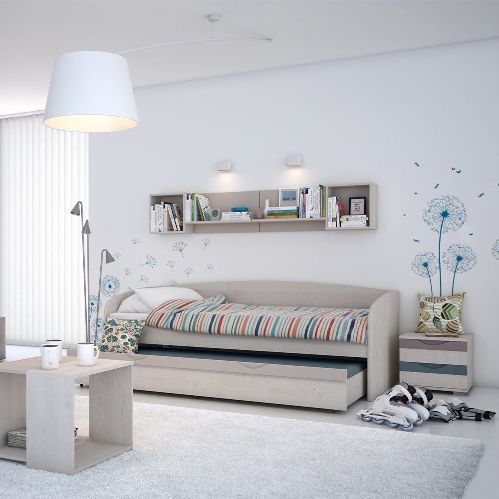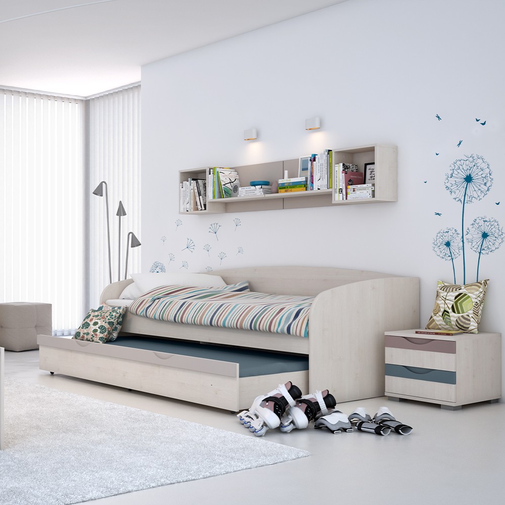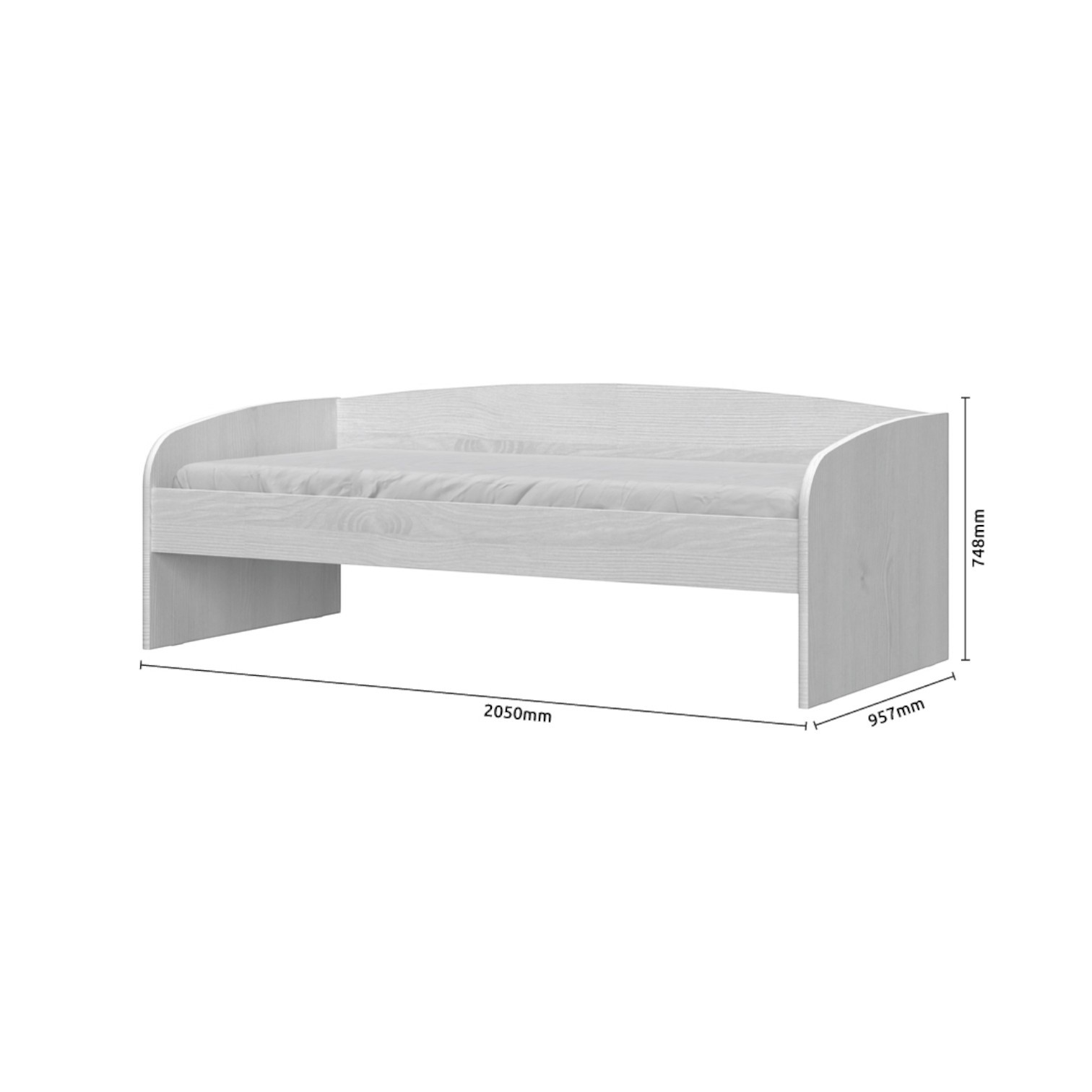 Krevet za dječju sobu s naslonom, iz kolekcije Joy, koji je primjeren za sve uzraste. Korpus elementa izrađen je od šperploče u drvnom dekoru polarni bor, a kantiran je ABS rubnom trakom od ekoloških materijala krevet je pogodan za madrac dimenzija 90x200 cm, moguće je umetnuti krevetnu ladicu FK80. Krevet se isporučuje bez madraca.
