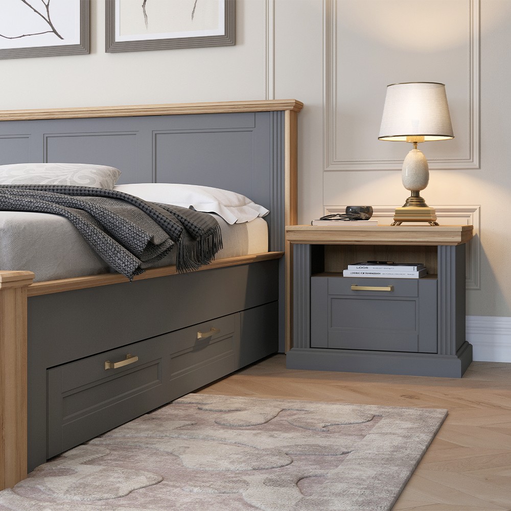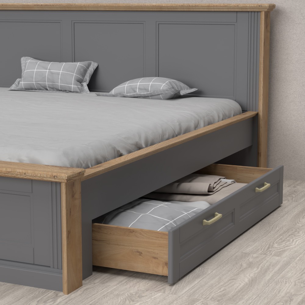 Ladica za krevet iz kolekcije Tara kompatibilna je s krevetom KR160-TA. Fronta ladice od rezbarenog medijapana lakiranog UV lakom s nježnim mat efektom u grafitnoj ili bijeloj boji. Korpus ladice izrađen je od šperploče u dekoru pacifičkog oraha, s bijelim podom ladica ima kotačiće za lakše rukovanje i ukrasne mesingane ručke (R-30).