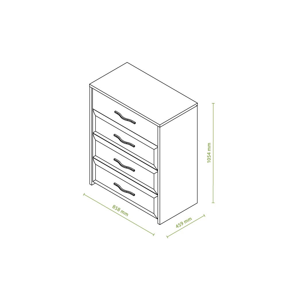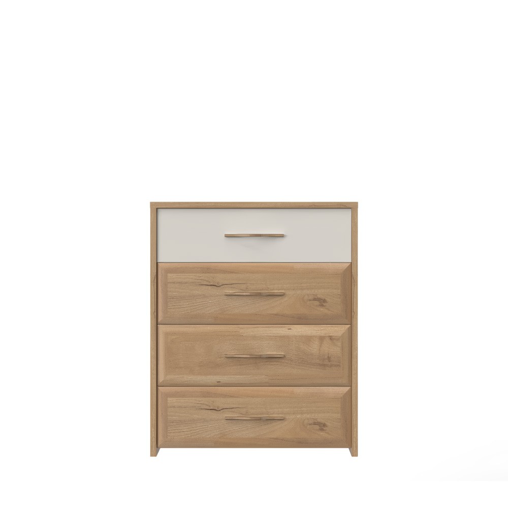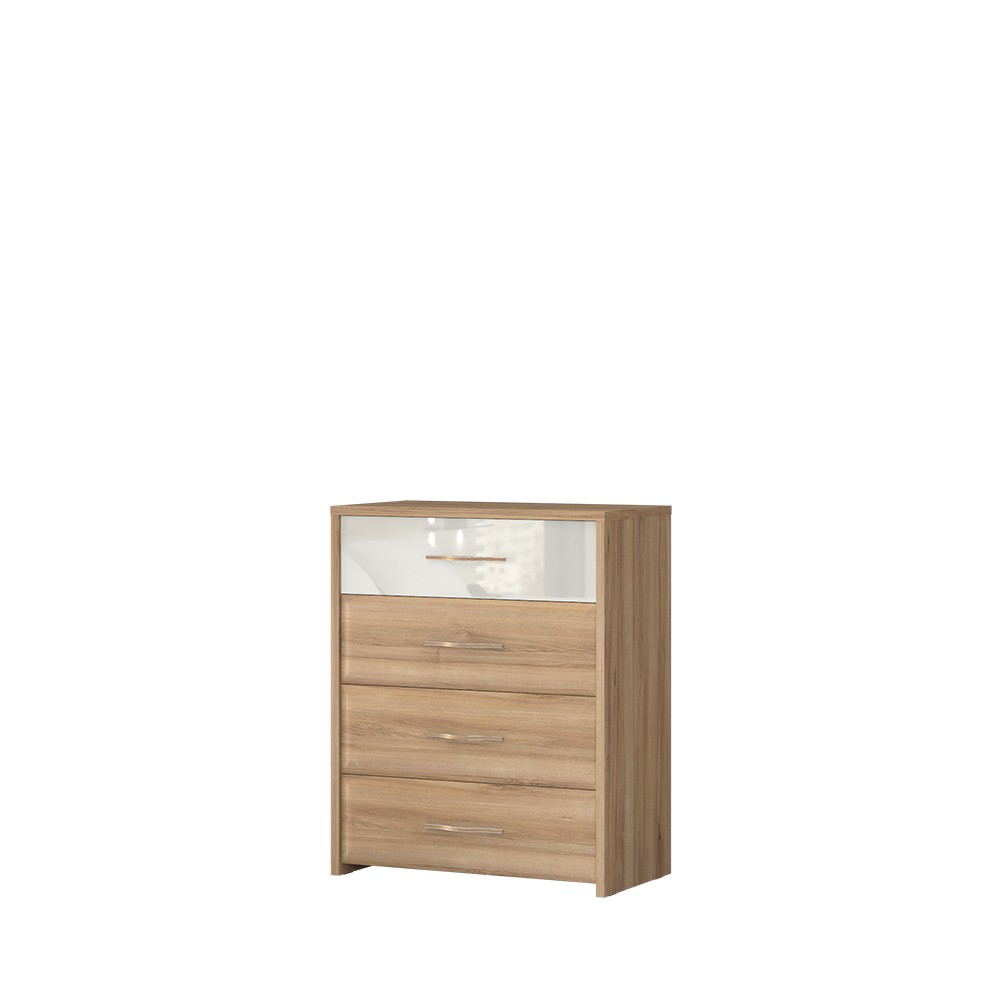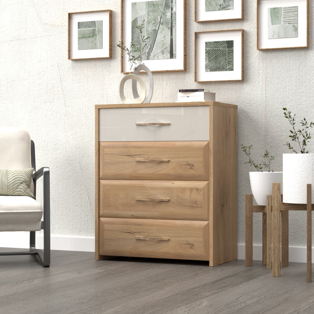 Ladičar za spavaću sobu, iz kolekcije Gala, modernog dizajna sa četiri ladice. Fronta prve ladice je od iverala lakiranog UV lakom u bež boji, dok su ostale ladice od medijapana u dekoru pacifik orah. Ručke na ladicama imaju aplikaciju u drvnom dekoru, soft-close klizači omogućuju tiho zatvaranje ladica što pruža dodatnu udobnost tijekom stalne uporabe.