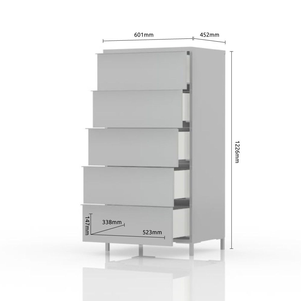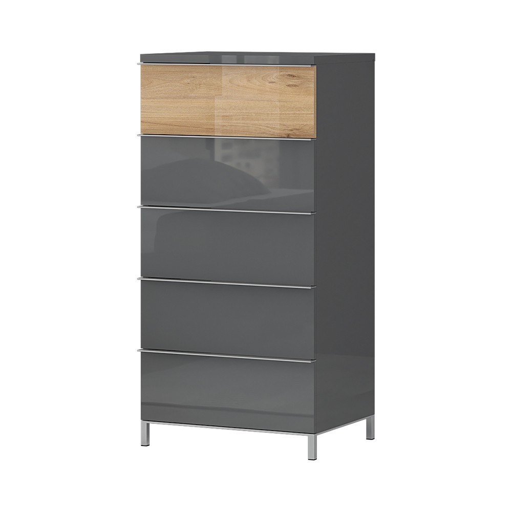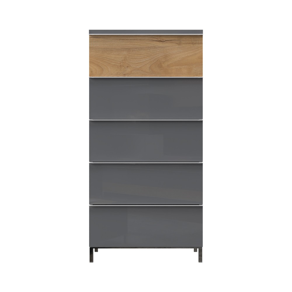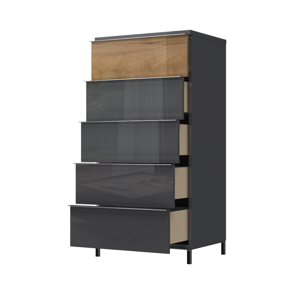 Ladičar s pet prostranih ladica, modernog dizajna i minimalističkog oblika. Vidljivi dijelovi elementa lakirani su UV lakom visokog sjaja u artactive antracit boji. Jedna fronta ladice je u dekoru drva pacifik orah, lakirana UV lakom u visokom sjaju. Unutarnji dijelovi korpusa su u toplom tekstilnom dekoru. Soft-close mehanizam omogućuje tiho zatvaranje ladice, što pruža dodatnu udobnost tijekom stalne uporabe. Soft-close klizači ladica smanjuju trenje tijekom uporabe, imaju veću otpornost na trošenje i habanje te osiguravaju maksimalnu dugovječnost u svakodnevnoj uporabi. Dubina unutarnje strane ladica je 16 cm, što ih čini vrlo praktičnim. Element ima kromirane elegantne nogice s okvirnom konstrukcijom i ukrasnom kromiranom ručkom.