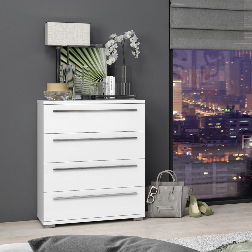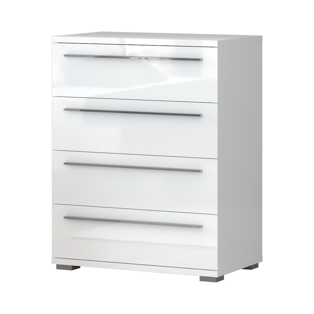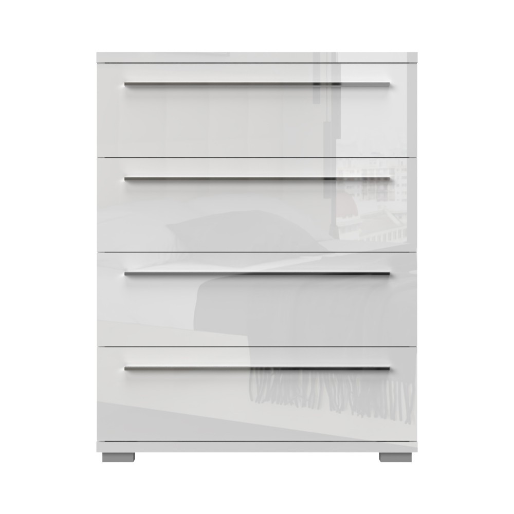 Komoda s četiri prostrane ladice, dizajnirana u geometrijskim oblicima iz kolekcije namještaja Piano. Fronte, stranice i strop elementa lakirani su UV lakom visokog sjaja, u toploj bež ili kristalno bijeloj boji. Unutarnji dijelovi korpusa su u bijeloj boji. Soft-close mehanizam omogućuje tiho zatvaranje ladice, što je dodatna prednost pri kontinuiranoj uporabi. Metalni segmenti novih klizača ladica s mekim zatvaranjem smanjuju trenje tijekom uporabe, imaju veću otpornost na habanje i osiguravaju maksimalnu dugovječnost u svakodnevnoj uporabi. Povećana dubina unutrašnjosti ladica čini ih vrlo praktičnima. Moderna, elegantna i prije svega funkcionalna komoda za spavaću sobu.