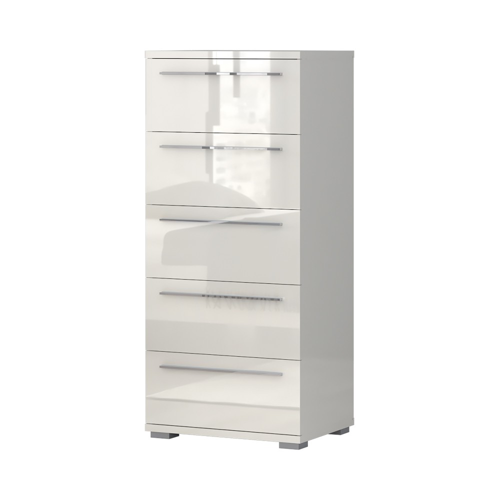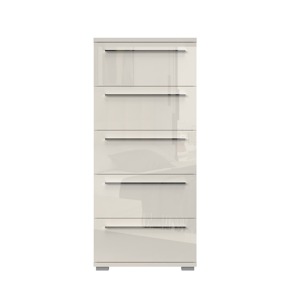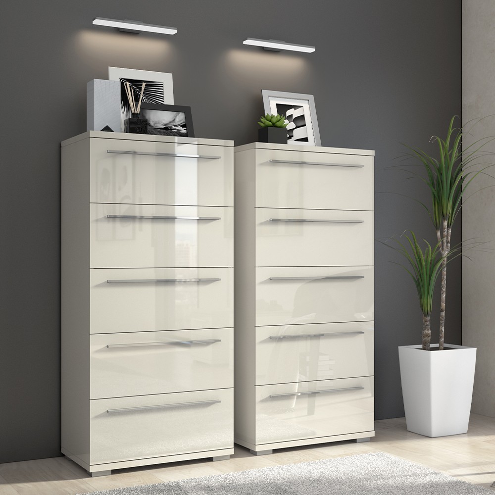 Ladičar s pet prostranih ladica iz kolekcije namještaja Piano. Fronte, stranice i strop elementa lakirani su UV lakom visokog sjaja u toploj bež ili kristalno bijeloj boji. Unutarnji dijelovi korpusa su u bijeloj boji. Soft-close mehanizam omogućuje tiho zatvaranje ladice, što je dodatna prednost pri kontinuiranoj uporabi. Metalni segmenti novih klizača ladica s mekim zatvaranjem smanjuju trenje tijekom uporabe, imaju veću otpornost na habanje i osiguravaju maksimalnu dugovječnost u svakodnevnoj uporabi. Povećana dubina unutrašnjosti ladica čini ih vrlo praktičnima. Moderna, elegantna i prije svega funkcionalna komoda za spavaću sobu.