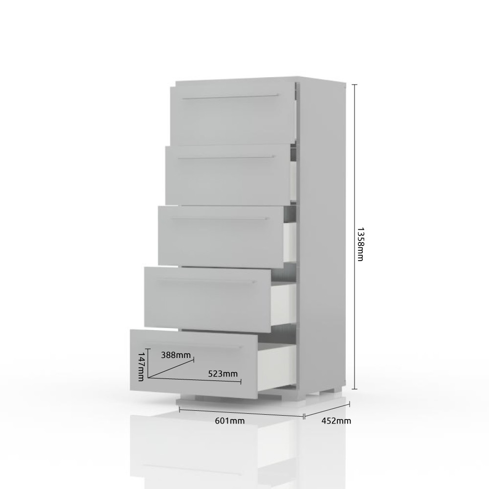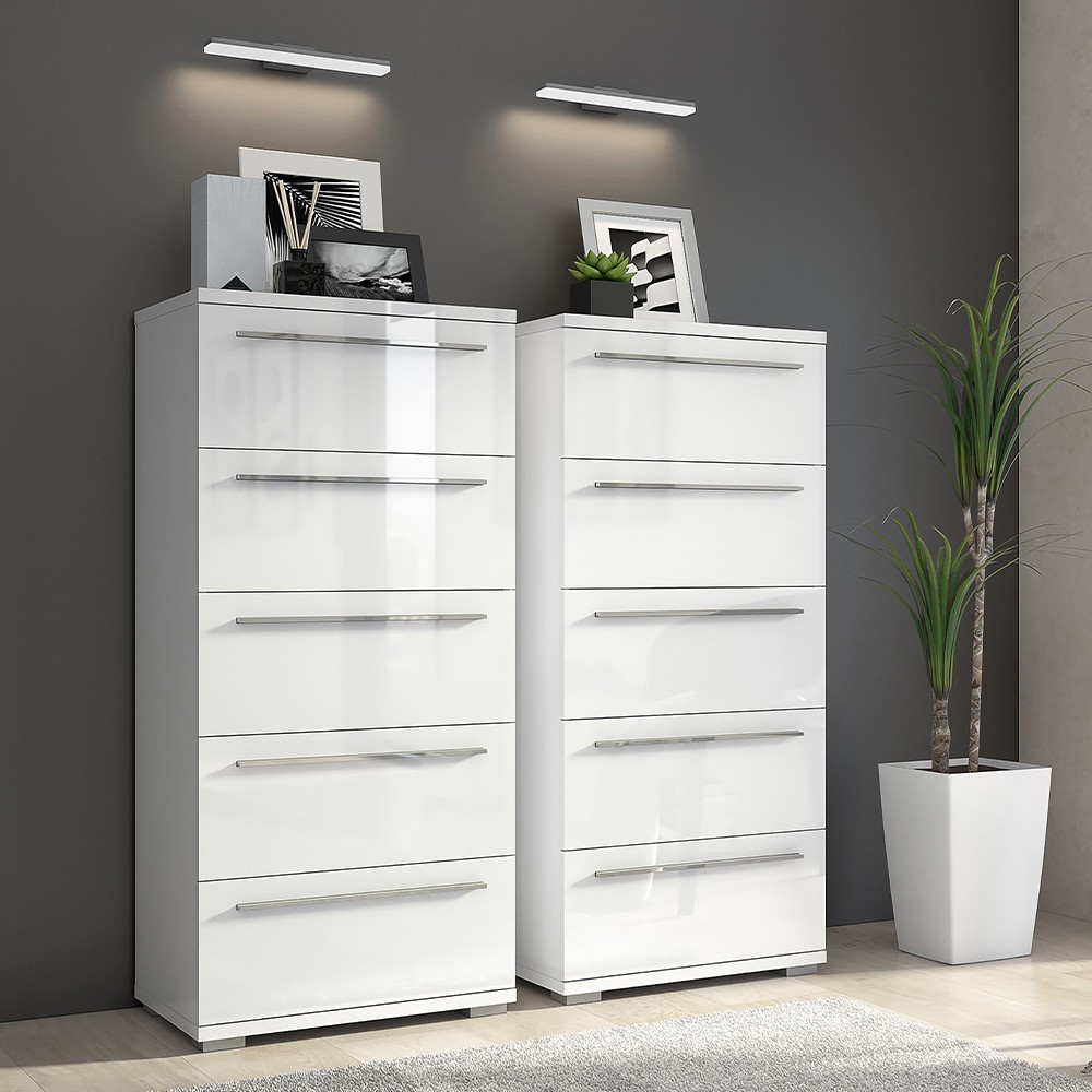 Ladičar s pet prostranih ladica iz kolekcije namještaja Piano. Fronte, stranice i strop elementa lakirani su UV lakom visokog sjaja u toploj bež ili kristalno bijeloj boji. Unutarnji dijelovi korpusa su u bijeloj boji. Soft-close mehanizam omogućuje tiho zatvaranje ladice, što je dodatna prednost pri kontinuiranoj uporabi. Metalni segmenti novih klizača ladica s mekim zatvaranjem smanjuju trenje tijekom uporabe, imaju veću otpornost na habanje i osiguravaju maksimalnu dugovječnost u svakodnevnoj uporabi. Povećana dubina unutrašnjosti ladica čini ih vrlo praktičnima. Moderna, elegantna i prije svega funkcionalna komoda za spavaću sobu.