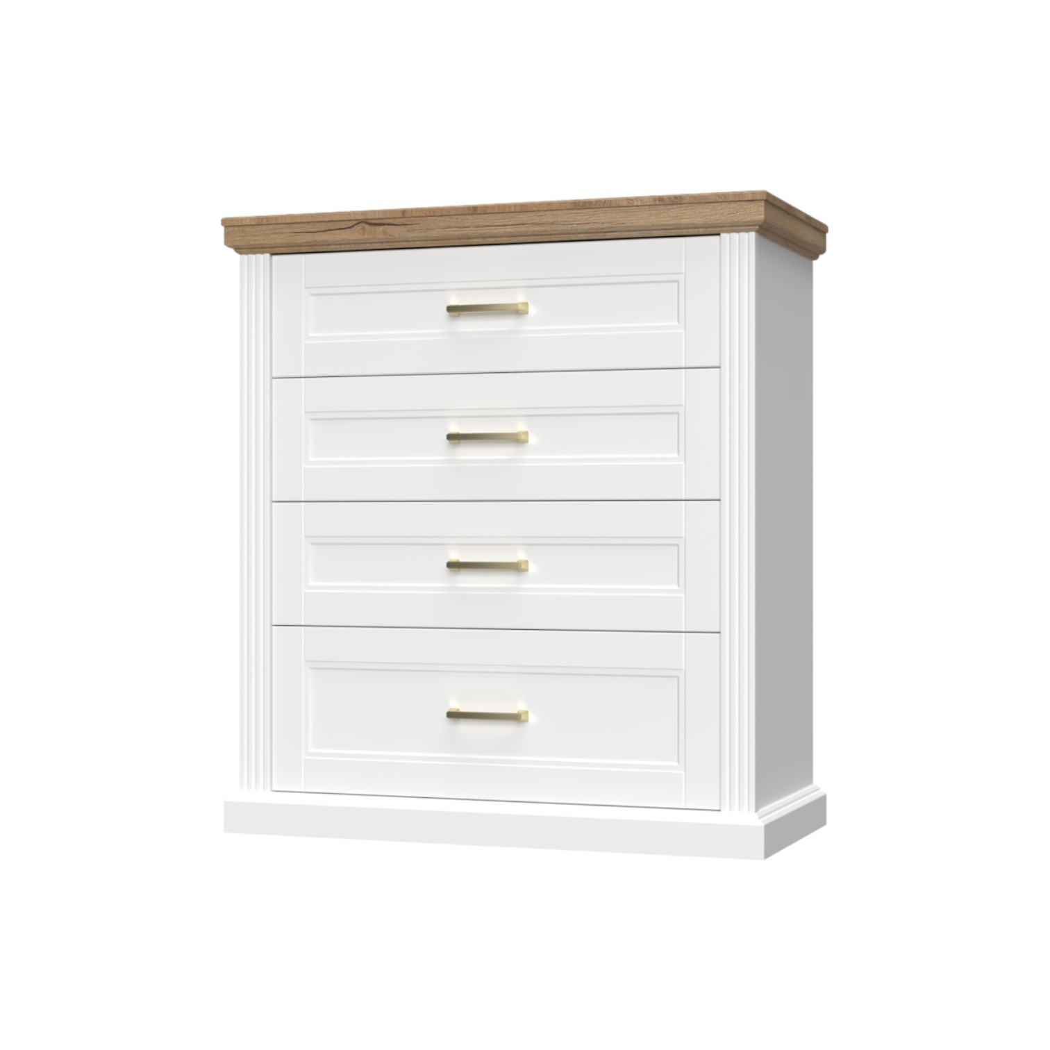 Ladičar s četiri ladice iz kolekcije Tara za savršenu organizaciju u Vašoj spavaćoj sobi. Fronte ladica izrađene su od rezbarenog medijapana lakiranog UV lakom s nježnim mat efektom u grafitnoj ili bijeloj boji, a ukrasna masivna pokrivna ploča izrađena je od medijapana obloženog folijom u dekoru pacifičkog oraha. Stilski profilirane lajsne izrađene su od MDF-a debljine 25 mm. Korpus elementa izrađen je od šperploče u dekoru pacifičkog oraha, sa vidljive strane lakirano UV lakom sa soft mat efektom u grafitnoj ili bijeloj boji. Unutrašnjost ladica u tekstilnom dekoru, soft-close klizači s usporivačima omogućuju sporo i tiho zatvaranje ladica. Podesive nogice za izravnavanje na neravnim površinama, kao i ukrasne ručke (R-30), uključene su u cijenu elementa.