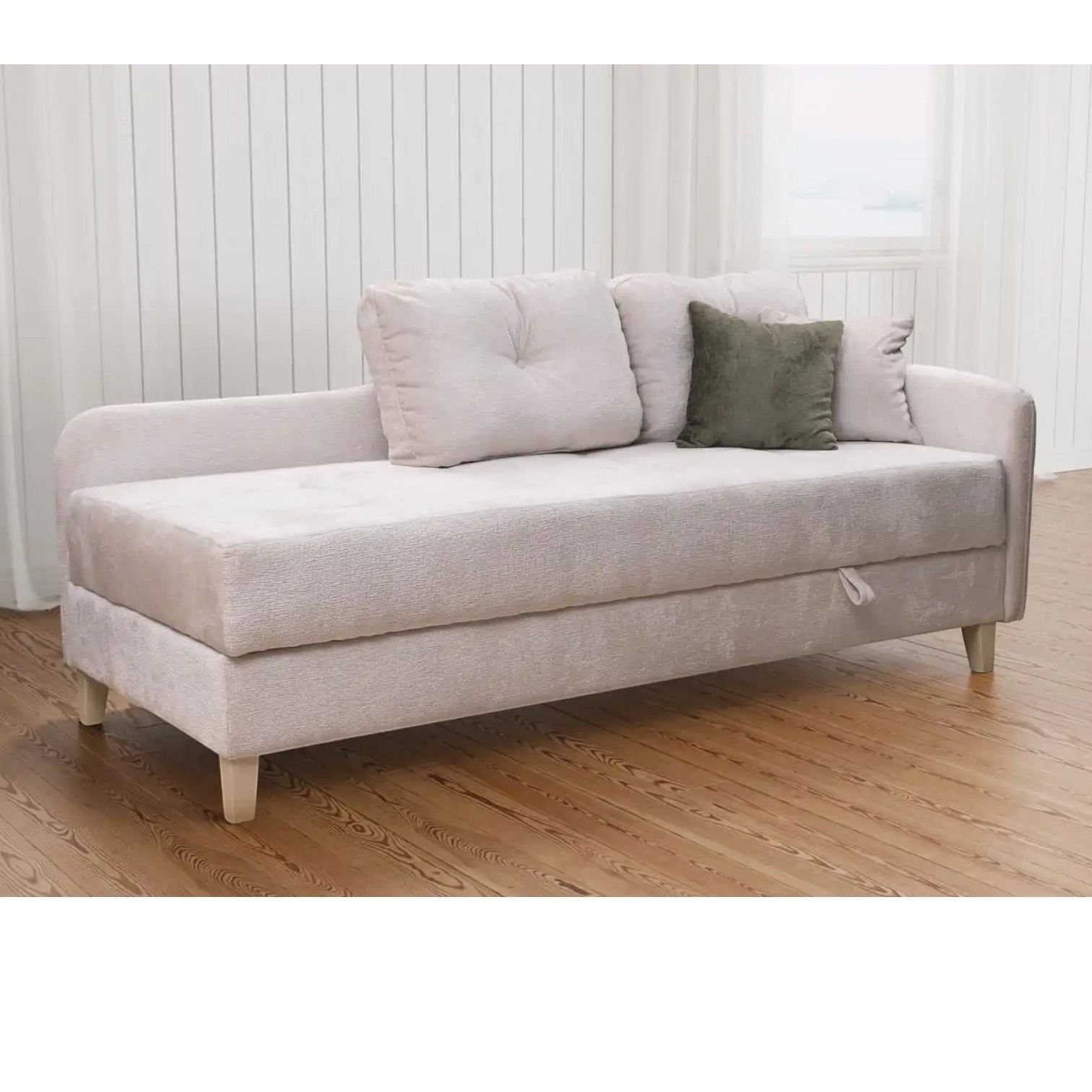 Ležaj klasičnog, elegantnog dizajna. Postoji mogućnost kombiniranja boja, uzoraka i odabira kuta. Vrlo udoban, sjedeći dio je žičana jezgra. Veliki izbor materijala. Drvena konstrukcija daje snagu i izdržljivost. Ležaj ima prostor za odlaganje stvari.