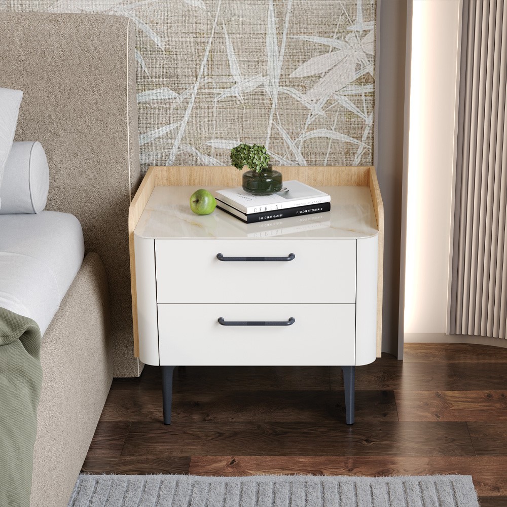 Noćni ormarić za spavaću sobu, iz kolekcije Air, sa dvije ladice sa skladnim i mekim frontama. Obje ladice lakirane UV lakom u boji pepper white. Dvostrane stranice čiji je vidljivi dio u dekoru furneo hrast 12 mm. Na stropu staklo 4 mm u mramornom dekoru Calcatta Oro. Unutrašnjost ladica u tekstil dekoru. Metalna ručkica i nogice u antracit dekoru. Soft-close klizači omogućuju tiho zatvaranje ladica što pruža dodatnu udobnost tijekom stalne uporabe.
