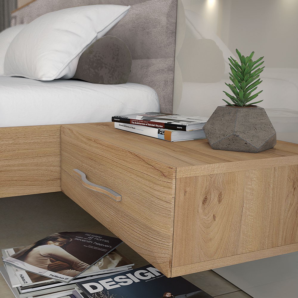 Noćni ormarić za spavaću sobu, iz kolekcije Gala, modernog dizajna, sa jednom ladicom i staklenom policom. Ovaj element namještaja namijenjen je za lijevu stranu kreveta. Noćni ormarić nije samostalan element, već se pričvršćuje uz krevet. Prednja strana ladice izrađena je od šperploče u dekoru pacifičkog oraha, korpus elementa je kombinacija iverala u dekoru drveta orah pacifik i iverala lakiranog UV lakom u bež boji. Noćni ormarić ima navlaku od medijapana u drvo dekoru pacifik orah i ručke s aplikacijom u drvo dekoru. Soft-close klizači omogućuju tiho zatvaranje ladica što pruža dodatnu udobnost tijekom stalne uporabe, a LED rasvjeta stvara toplu atmosferu u spavaćoj sobi. Element sadrži jednu staklenu policu.