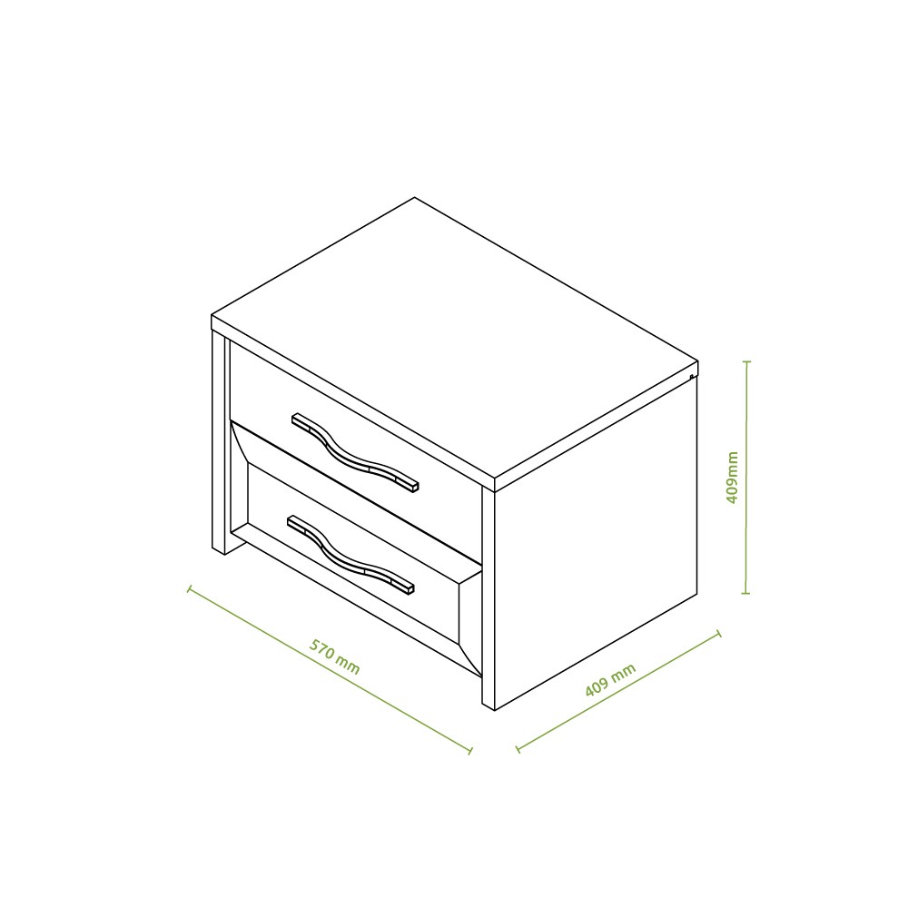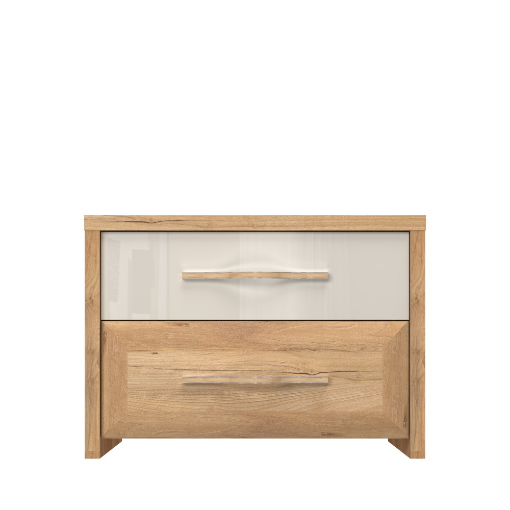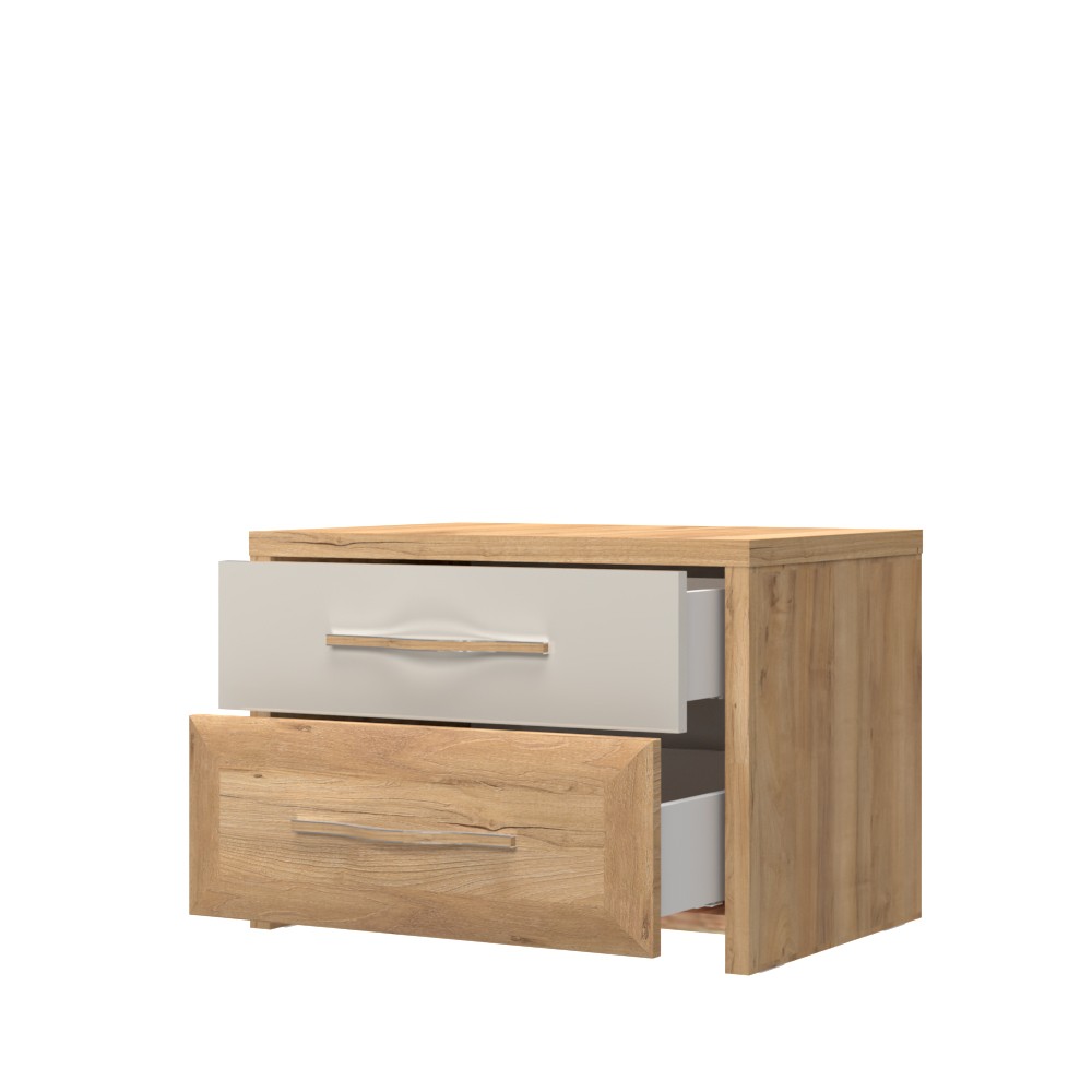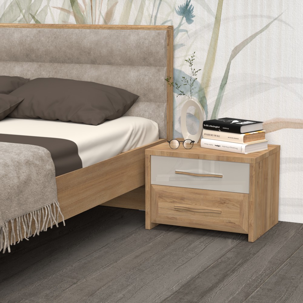 Noćni ormarić za spavaću sobu, iz kolekcije Gala, modernog dizajna, sa dvije ladice. Fronta gornje ladice je od iverala lakiranog UV lakom u bež boji, dok je fronta donje ladice od medijapana u dekoru pacifik orah. Korpus elementa izrađen je od šperploče u dekoru pacifik orah. Ručke na ladicama imaju aplikaciju u drvo dekoru, soft-close klizači omogućuju tiho zatvaranje ladica što pruža dodatnu udobnost tijekom stalne uporabe.