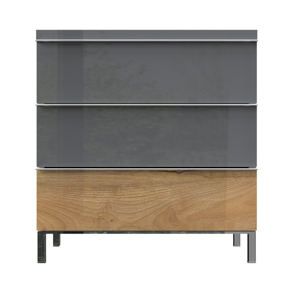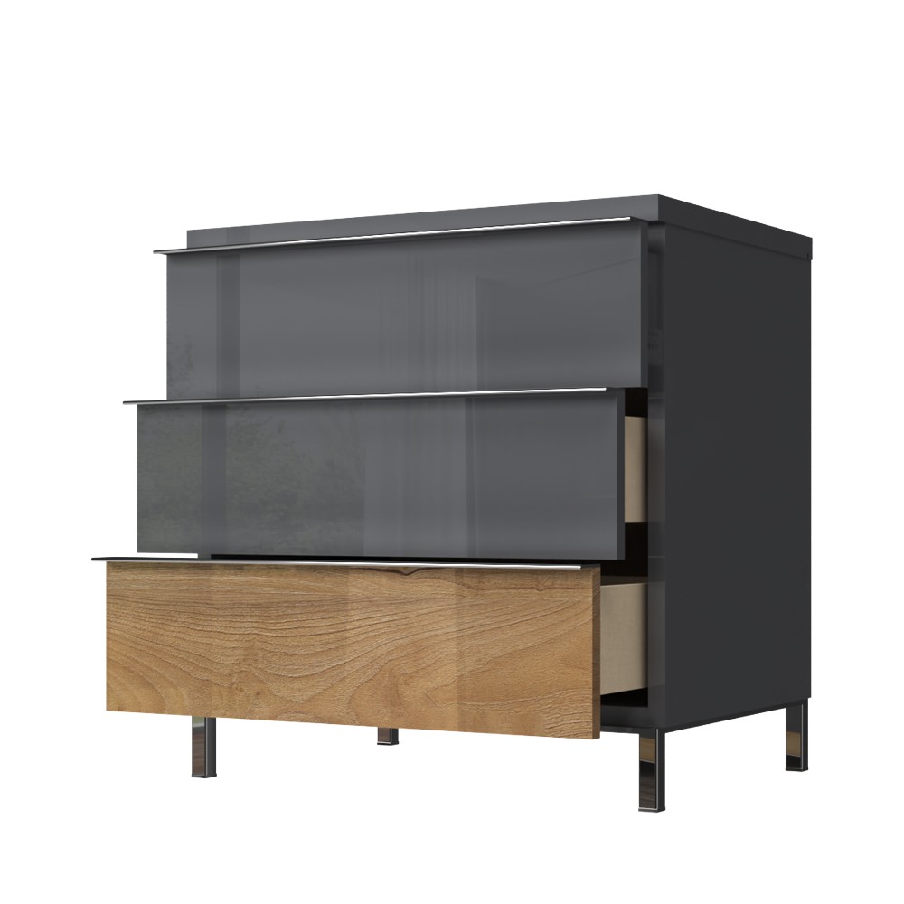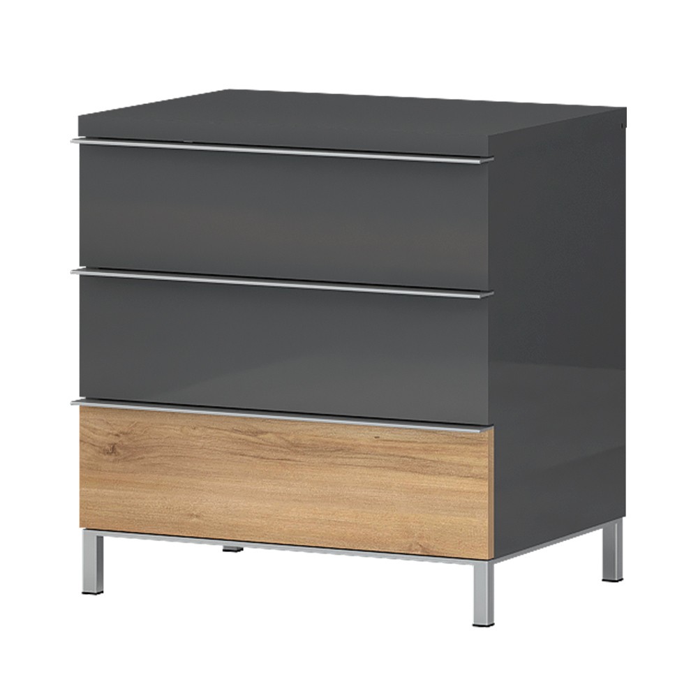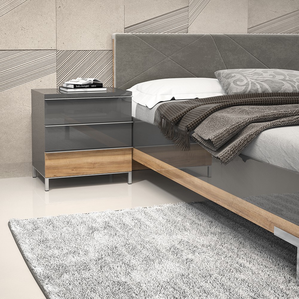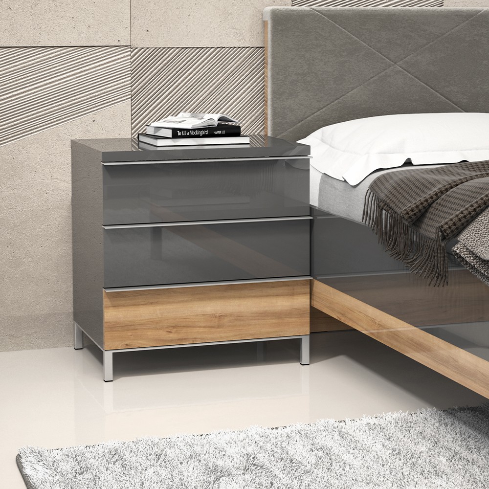 Noćni ormarić s tri ladice (soft-close), kompletno lakirano UV lakom, unutrašnjost elementa u dekoru tekstil. Metalne kromirane nogice, kromirane ručke, iveral debljine do 25 mm lakirano UV lakom u boji antracit HG lak i pacifički orah.