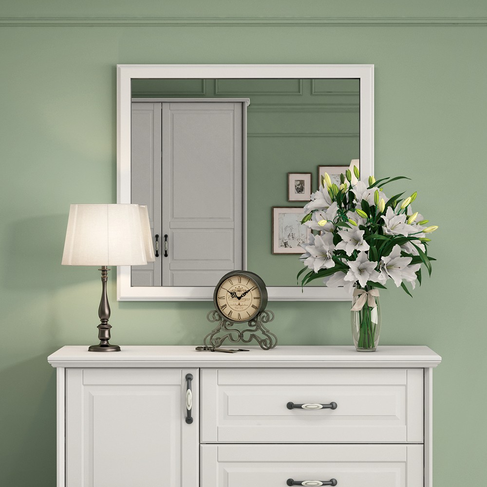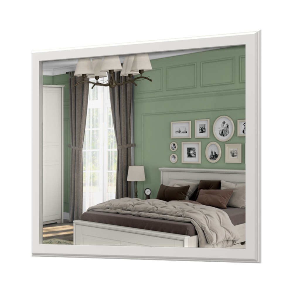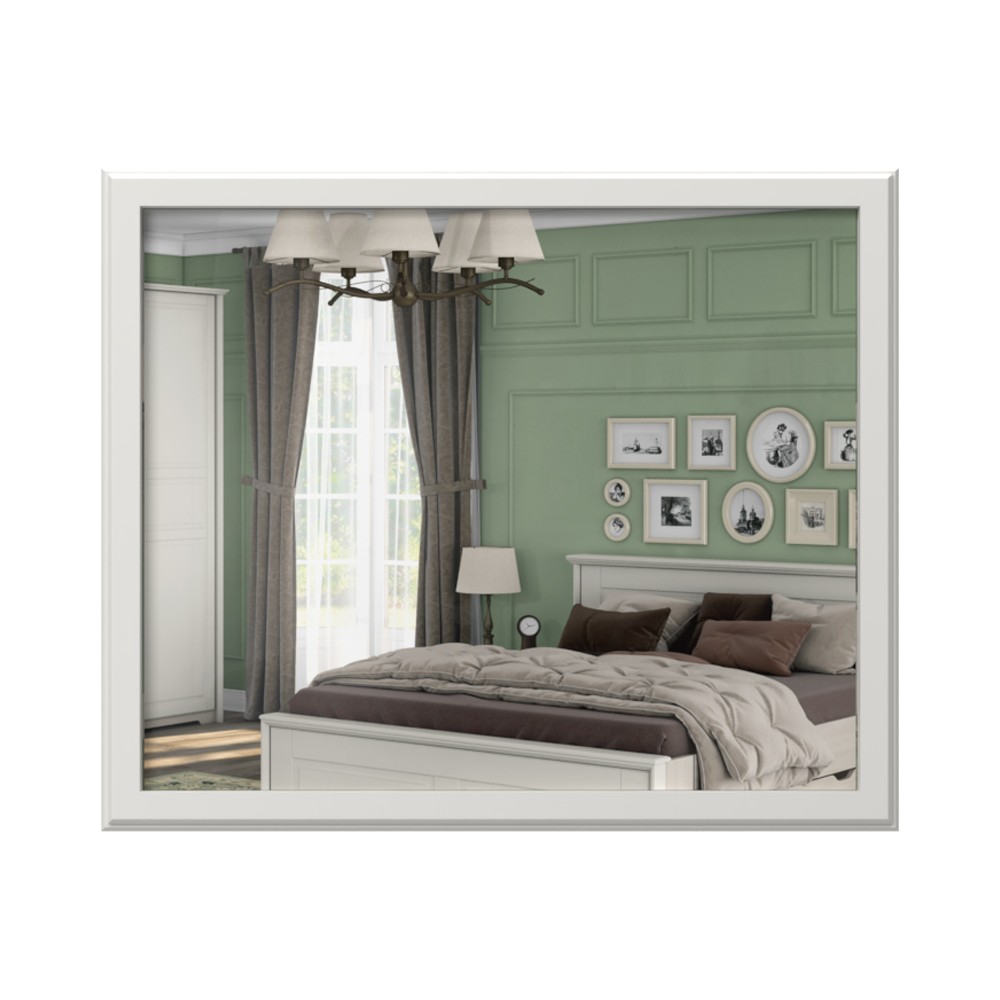 Ogledalo iz kolekcije rustikalnog namještaja Evergreen, za spavaću ili dnevnu sobu. Ogledalo na podlozi od iverala u bijelom drvenom dekoru sa okvirom od ukrasnih profiliranih lajsni od medijapana debljine 25 mm u boji slonove kosti. Element je opremljen potrebnim okovom za vješanje.