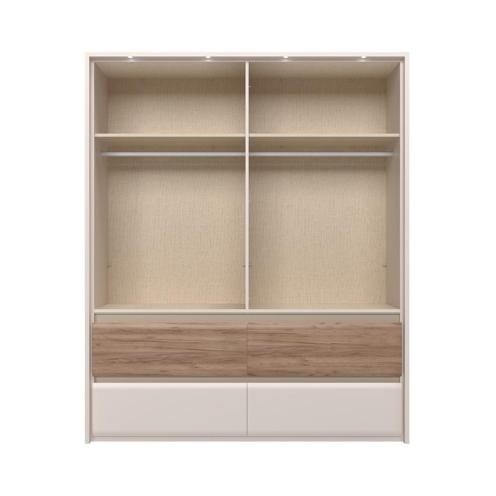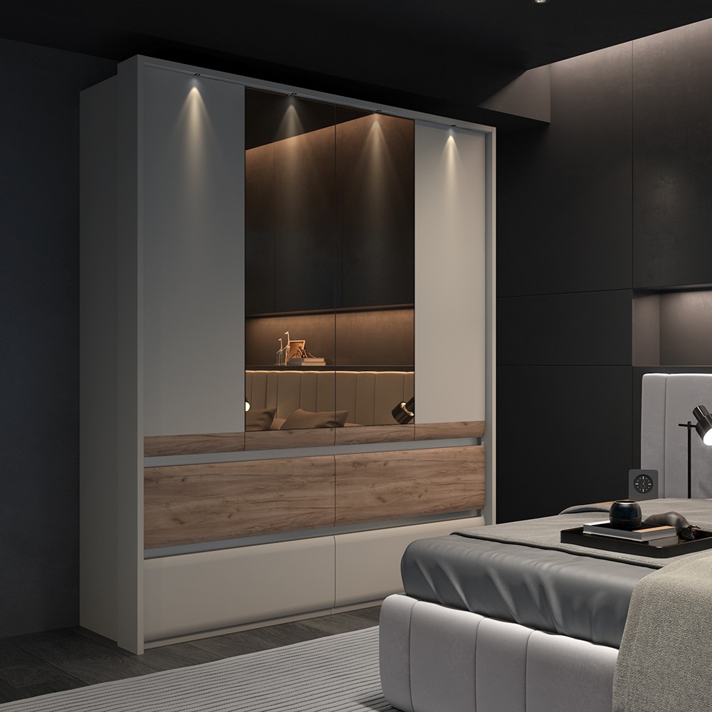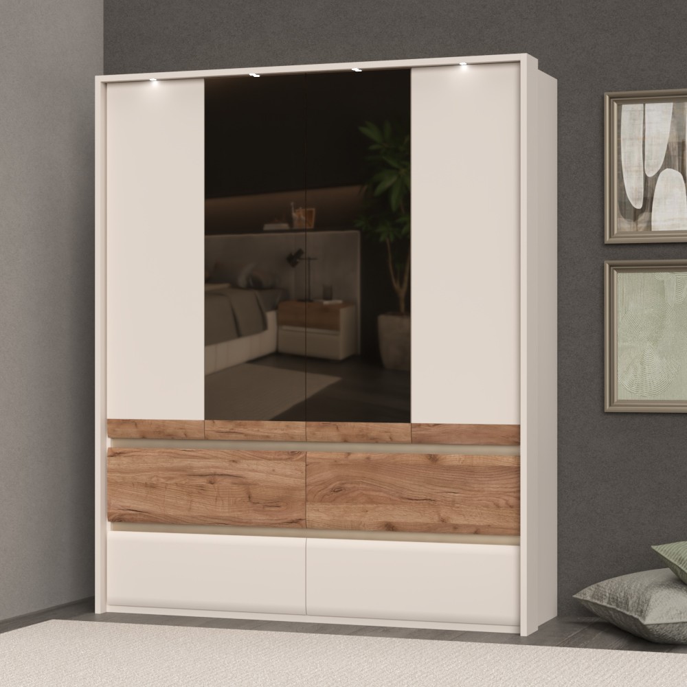 Ormar za spavaću sobu iz prestižne kolekcije Invictus sa četiri krila od kojih dva imaju ogledala i četiri ladice sa skladnim i mekim frontama. Krila elementa u boji kašmira s ogledalom i profiliranom aplikacijom od medijapana u drvenom dekoru hrast duhan. Fronte ladica izrađene su od profilirane šperploče u dekoru hrasta duhana i kašmir mat boji. Unutarnji dijelovi tijela su u toplom tekstilnom dekoru. Soft-close šarke i soft-close klizači s usporivačem omogućuju tiho zatvaranje krila i ladica što daje dodatnu udobnost pri stalnoj uporabi. Estetski izgled ormara upotpunjuju bočne i stropne letvice debljine 25 mm, te rasvjeta. Ukrasne lajsne, četiri LED svjetla i LED napajanje su uključeni u cijenu proizvoda. Uz pomoć ponuđene dodatne opreme imate mogućnost kreirati unutrašnjost ormara prema Vašim potrebama. Spoj lijepog i jednostavnog u ormaru u kojem su sve stvari uredno posložene.
