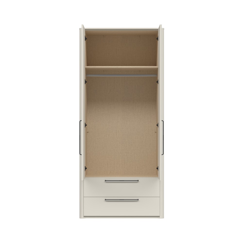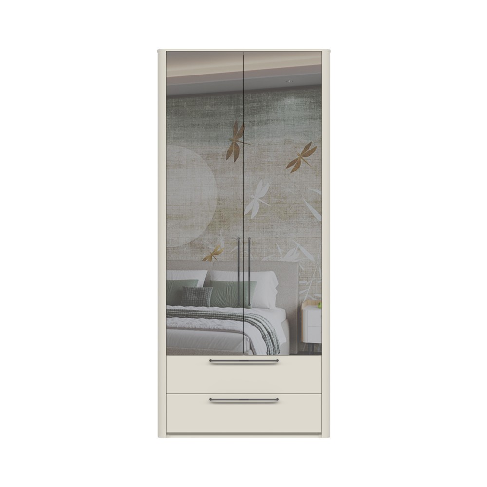 Dvokrilni ormar sa ogledalom i dvije ladice, obostrano lakirani UV mat lakom u dekoru pepper white. Unutrašnjost elementa i ladica je u tekstil dekoru. Ormar posjeduje jednu ladicu i jednu garderobernu šipku. Ručke su u antracit dekoru. Skriveni klizači s usporivačima, šarke s crnim usporivačima i nivelirajuće nogice.