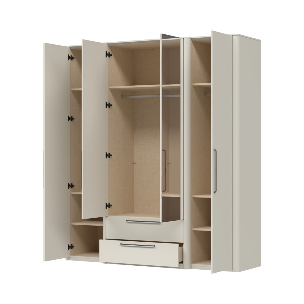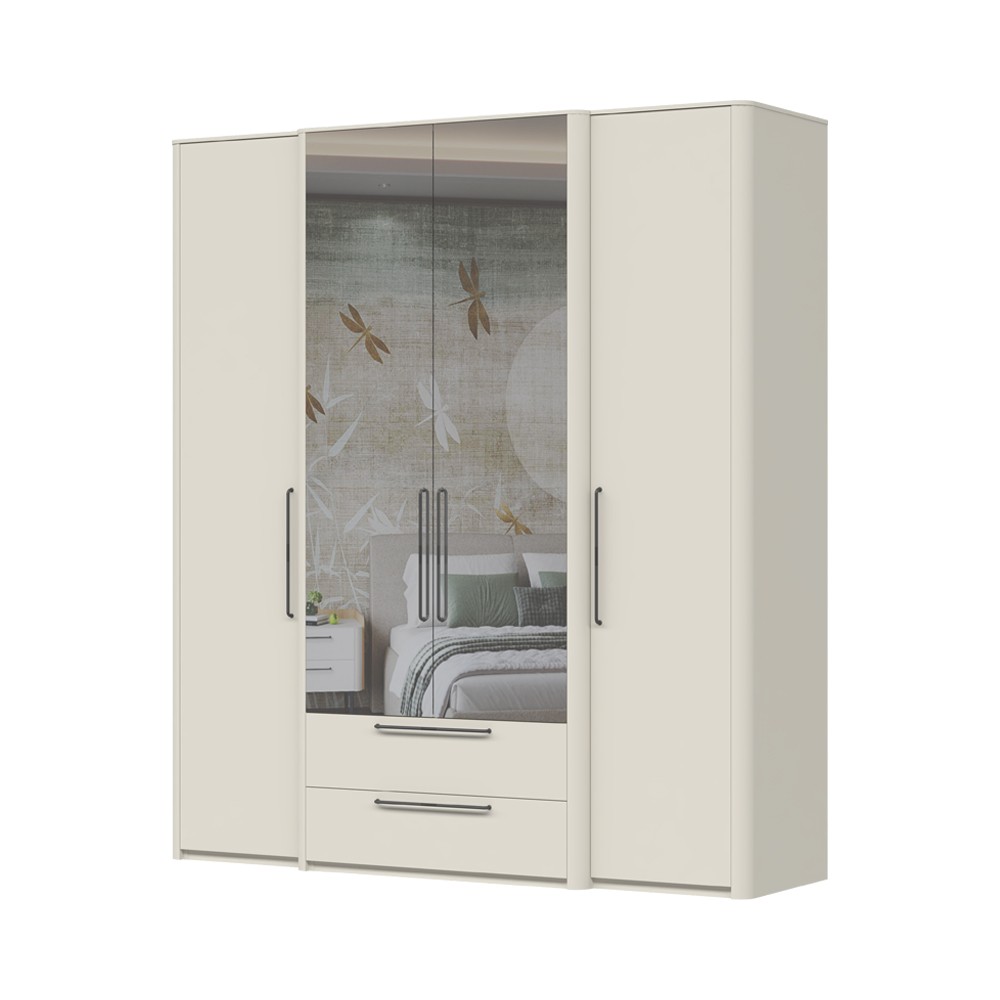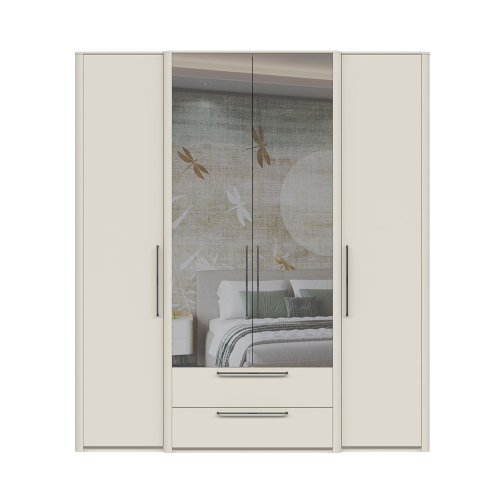 Ormar za spavaću sobu iz kolekcije Air sa četiri krila od kojih su dva sa ogledalima i dvije ladice. Fronte ladica i krila elementa lakirani su obostrano UV lakom s nježnim mat efektom u boji pepper white. Estetski izgled ormara upotpunjuju bočne lajsne od MDF-a u boji pepper white i stropne lajsne 12 mm. Unutarnji dijelovi korpusa su u tekstil dekoru. Soft-close šarke u crnoj boji i soft-close klizači s usporivačem omogućuju tiho zatvaranje krila i ladica, što daje dodatnu udobnost tijekom stalne uporabe. Metalne ručkice su u antracit boji. U cijenu ulazi jedna veća i šest manjih polica. Ormar ima jednu dužu i dvije kraće garderobne šipke.