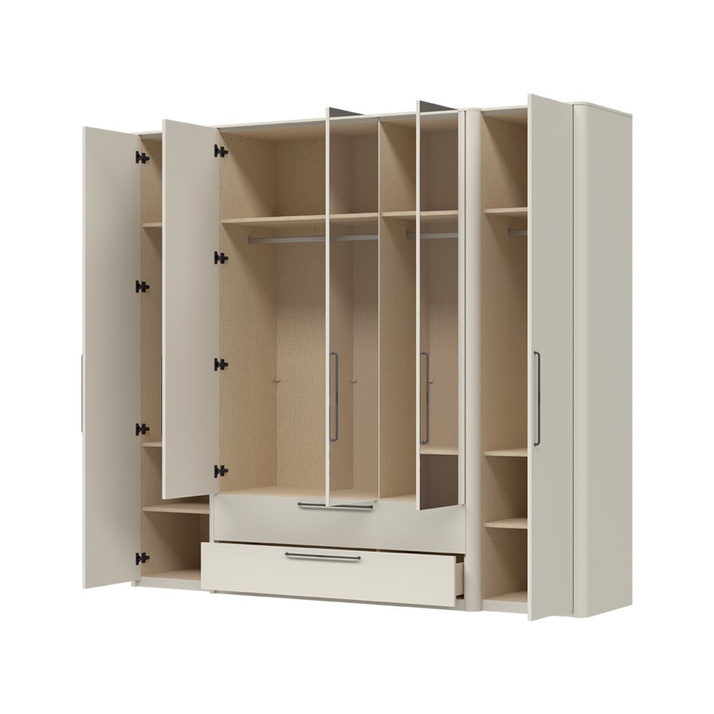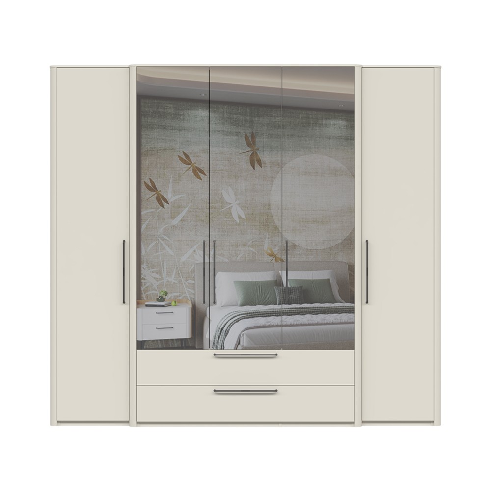 Ormar za spavaću sobu iz kolekcije Air s pet krila od kojih su tri s ogledalima i dvije ladice. Fronte ladica i krila elementa lakirani su obostrano UV lakom s nježnim mat efektom u boji pepper white. Estetski izgled ormara upotpunjuju bočne lajsne od MDF-a u boji pepper white i stropne lajsne 12 mm. Unutarnji dijelovi korpusa su u tekstil dekoru. Soft-close šarke u crnoj boji i soft-close klizači s usporivačem omogućuju tiho zatvaranje krila i ladica, što daje dodatnu udobnost tijekom stalne uporabe. Metalne ručkice su u antracit boji. U cijenu je uključena jedna veća i sedam manjih polica. Ormar ima jednu dužu i tri kraće garderobne šipke.