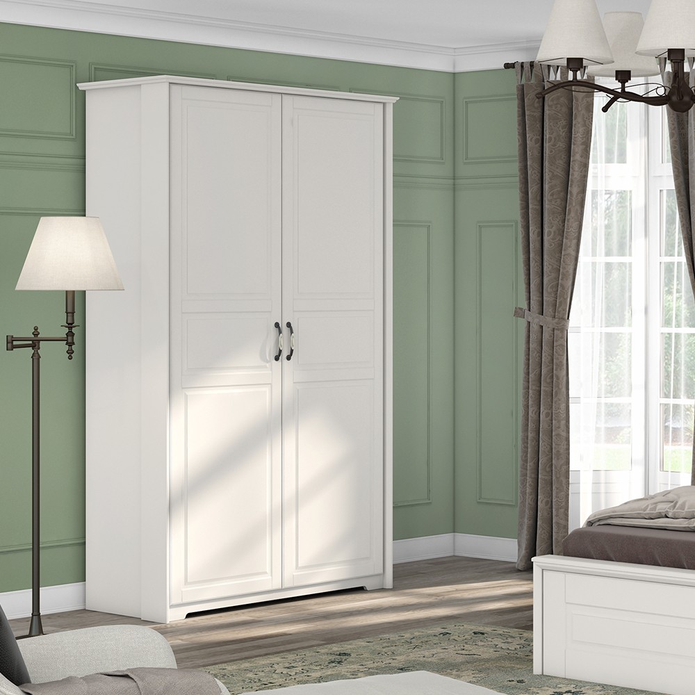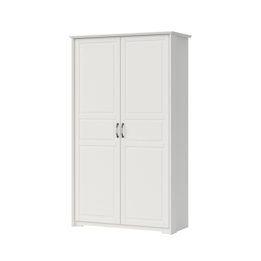 Dvostruki ormar za spavaću sobu iz rustikalno dizajnirane kolekcije namještaja Evergreen. Profilirane fronte izrađene su od MDF-a lakiranog UV lakom s mekim mat efektom u boji slonova kost. Dizajn elementa zaokružuju ukrasne lajsne debljine 25 mm. Korpus je izrađen od šperploče u dekoru polarni bor. Element je kantiran i sa stražnje strane. Ormar ima jednu garderobnu šipku, dvije police i ukrasne ručke (R-19). Soft-close šarke omogućuju tiho i sporo zatvaranje krila. Niveliri pružaju mogućnost niveliranja na neravnim površinama. Funkcionalnost ovog ormara možete povećati F-EG policama koje su dostupne kao dodatna oprema.