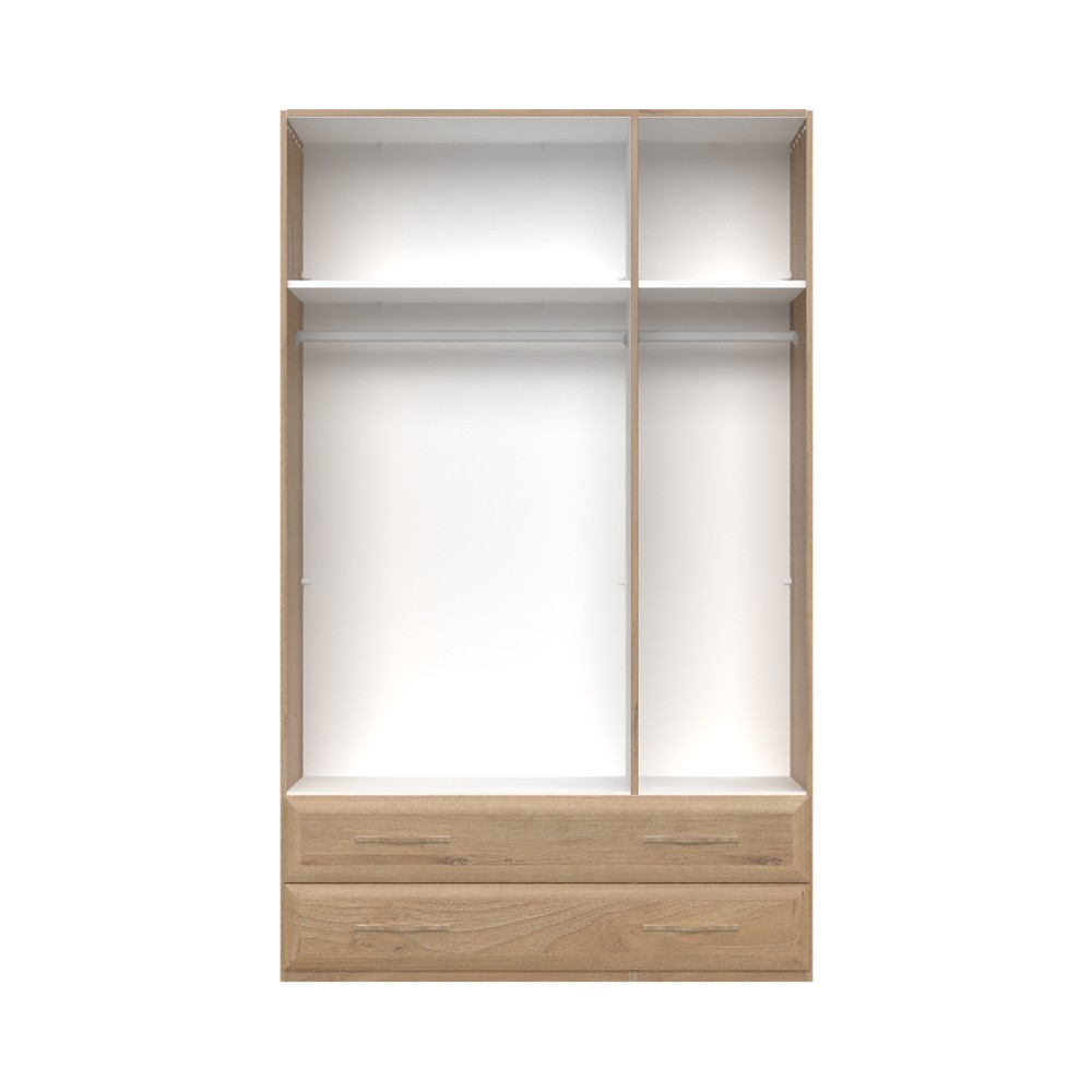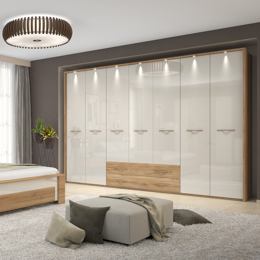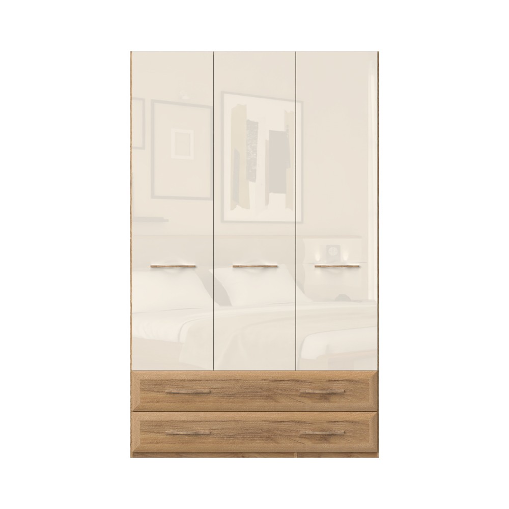 Funkcionalni ormar za spavaću sobu‚ iz kolekcije Gala jakih geometrijskih oblika. Ovaj komad namještaja sadrži tri krila i dvije ladice. Fronte ormara su lakirane UV lakom visokog sjaja u bež boji, fronte ladica i stranice ormara izrađene su u dekoru pacifičkog oraha. Unutarnji dijelovi korpusa su bijeli, ručke imaju aplikaciju u drvenom dekoru. Soft-close šarke i klizači omogućuju tiho zatvaranje krila i ladica, što daje dodatnu udobnost tijekom stalne uporabe. Ormar sadrži jednu veću i jednu manju policu, te jednu manju i jednu veću garderobnu šipku. Podesive nogice omogućuju izravnavanje na neravnim površinama. Naglasite estetski izgled ormara bočnim i stropnim letvicama sa ili bez LED rasvjete u drvnom dekoru pacifički orah debljine 25 mm. Dodatna oprema pruža mogućnost kreiranja unutrašnjosti ormara prema Vašim potrebama.