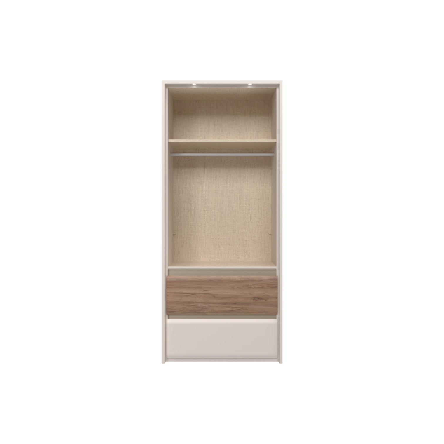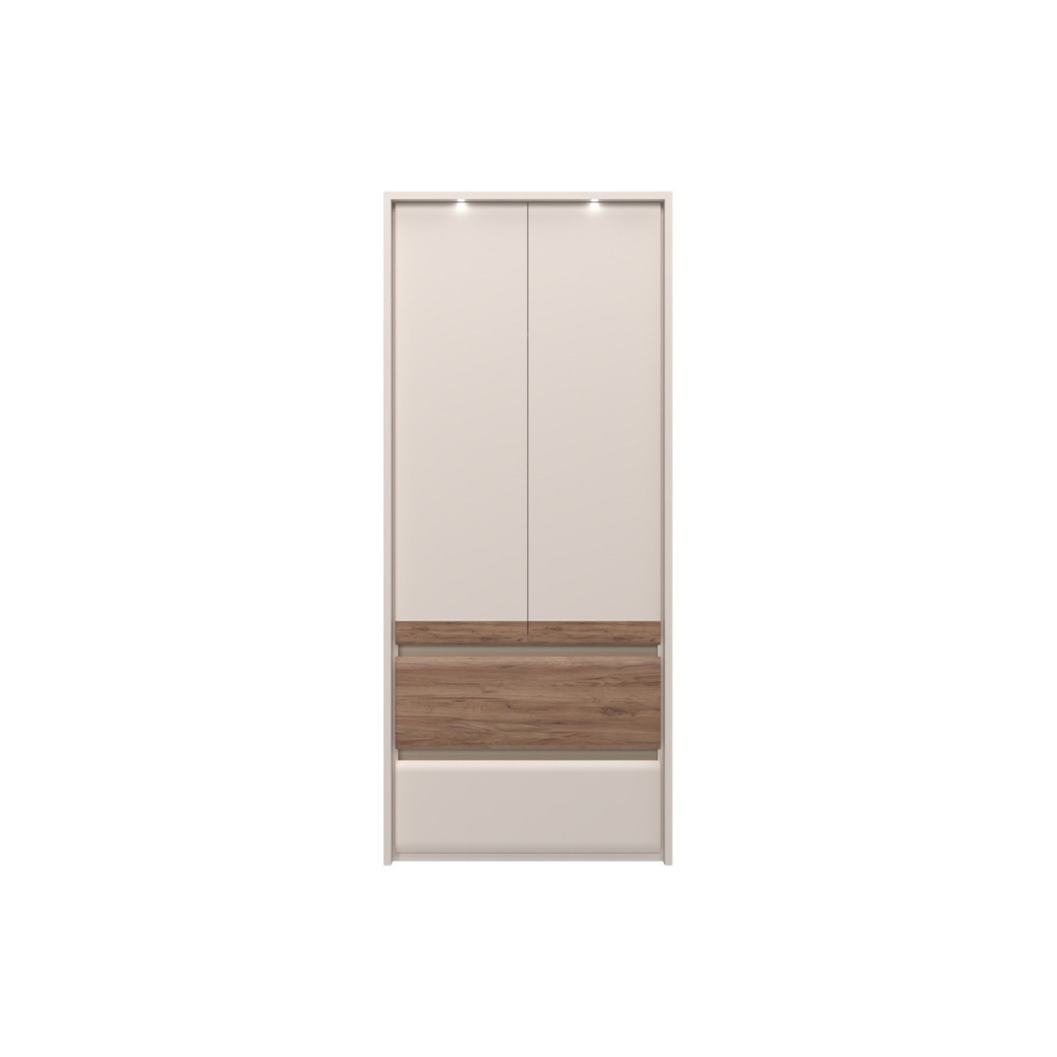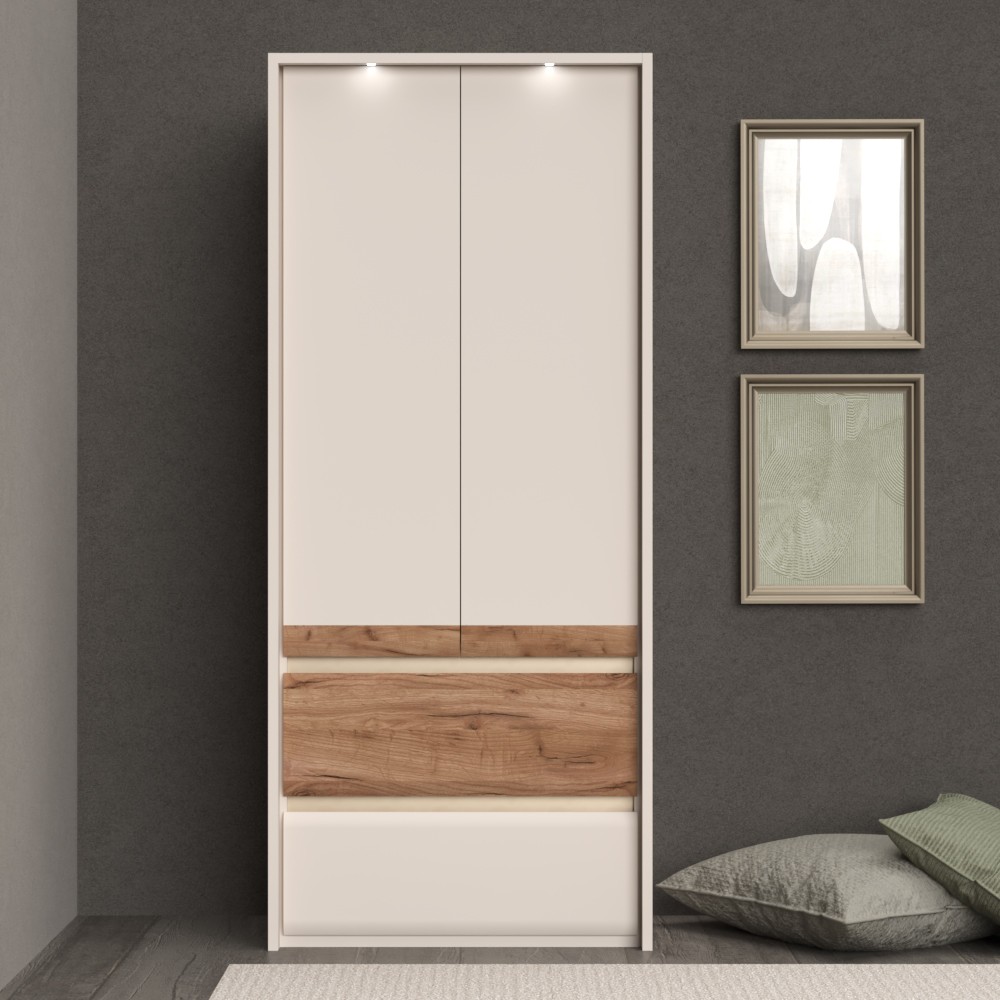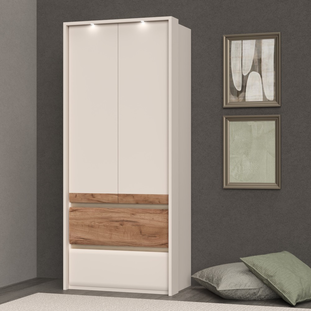 Ormar za spavaću sobu iz prestižne kolekcije Invictus sa dva krila i dvije ladice sa skladnim i mekim frontama. Krila elementa su obostrano lakirana UV lakom s soft mat efektom u boji kašmira s aplikacijom od profiliranog medijapana u drvo-dekoru duhan hrast. Fronte ladica izrađene su od profilirane šperploče u dekoru hrasta duhana i kašmir mat boji. Unutarnji dijelovi korpusa su u toplom tekstilnom dekoru, soft-close šarke i soft-close klizači s usporivačem omogućuju tiho zatvaranje krila i ladica što daje dodatnu udobnost pri stalnoj uporabi. Estetski izgled ormara upotpunjuju bočne i stropne letvice debljine 25 mm te rasvjeta. Ukrasne lajsne, dvije LED lampice i LED napajanje su uključeni u cijenu proizvoda. Uz pomoć ponuđene dodatne opreme imate mogućnost kreirati unutrašnjost ormara prema Vašim potrebama.