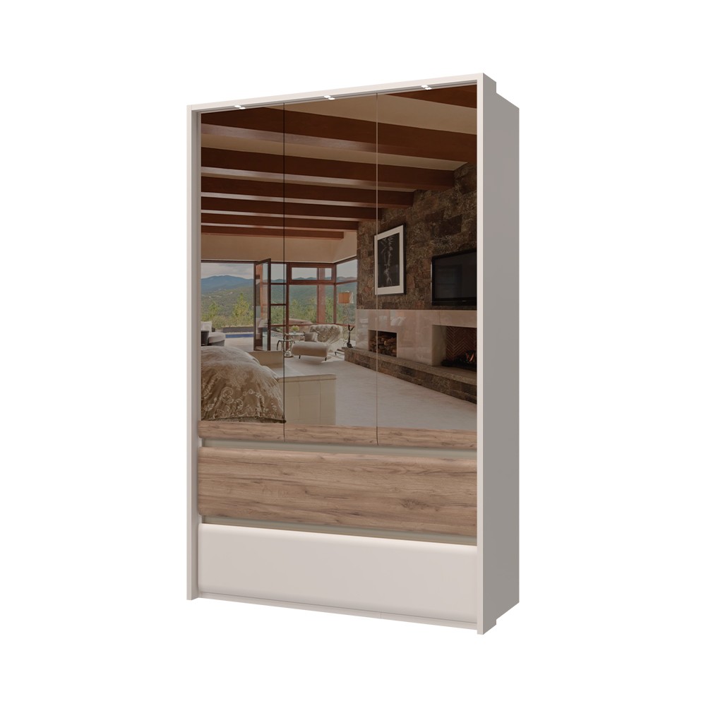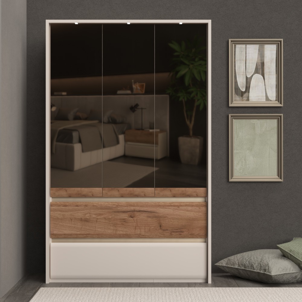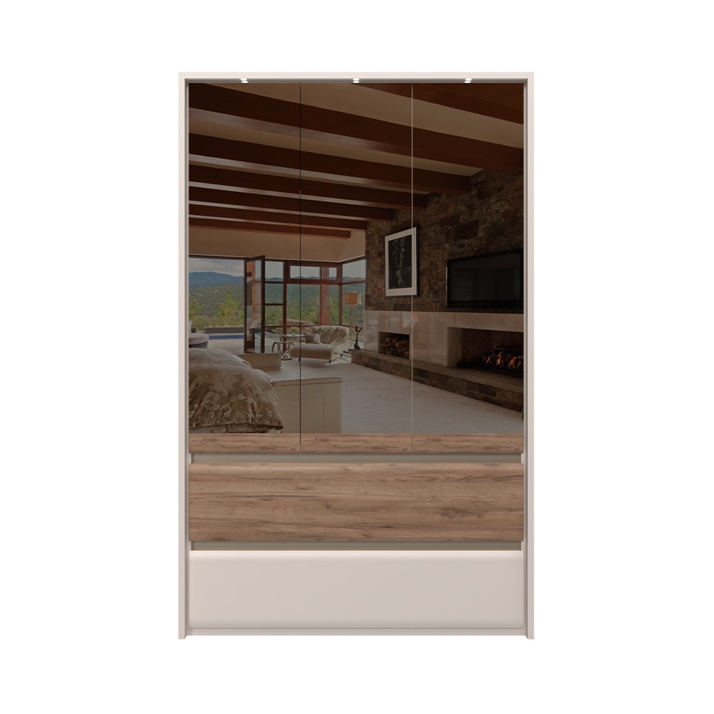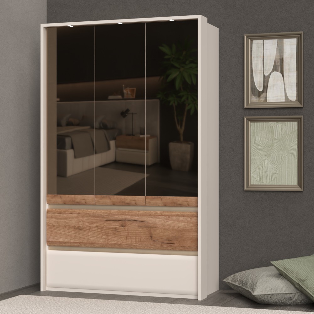 Ormar za spavaću sobu iz prestižne kolekcije Invictus sa tri krila, sva 3 sa ogledalom debljine 3 mm. MDF aplikacija 18 mm na krilu u dekoru hrast duhan, zaobljena s donje strane. Stranice u Cashmere mat UV laku., dvije ladice, zaobljene s gornje i donje strane, korpus u textil dekoru 16 mm debljine, sa MDF maskama 18 mm u dekoru tobacco hrast i kašmir mat lak. Unutrašnjost u textil dekoru, 1 veća, 1 manja ladica i 2 šipke za garderobu. Soft-close šarke na krilima, soft close klizači na ladicama. ALU profil u funkciji ručke za otvaranje krila i ladica, podesive nogice, okvir ormara 25 mm u kašmir mat UV laku. Uključeno u cijenu rasvjeta (3 žarulje i LED napajanje uključeno u cijenu proizvoda).
