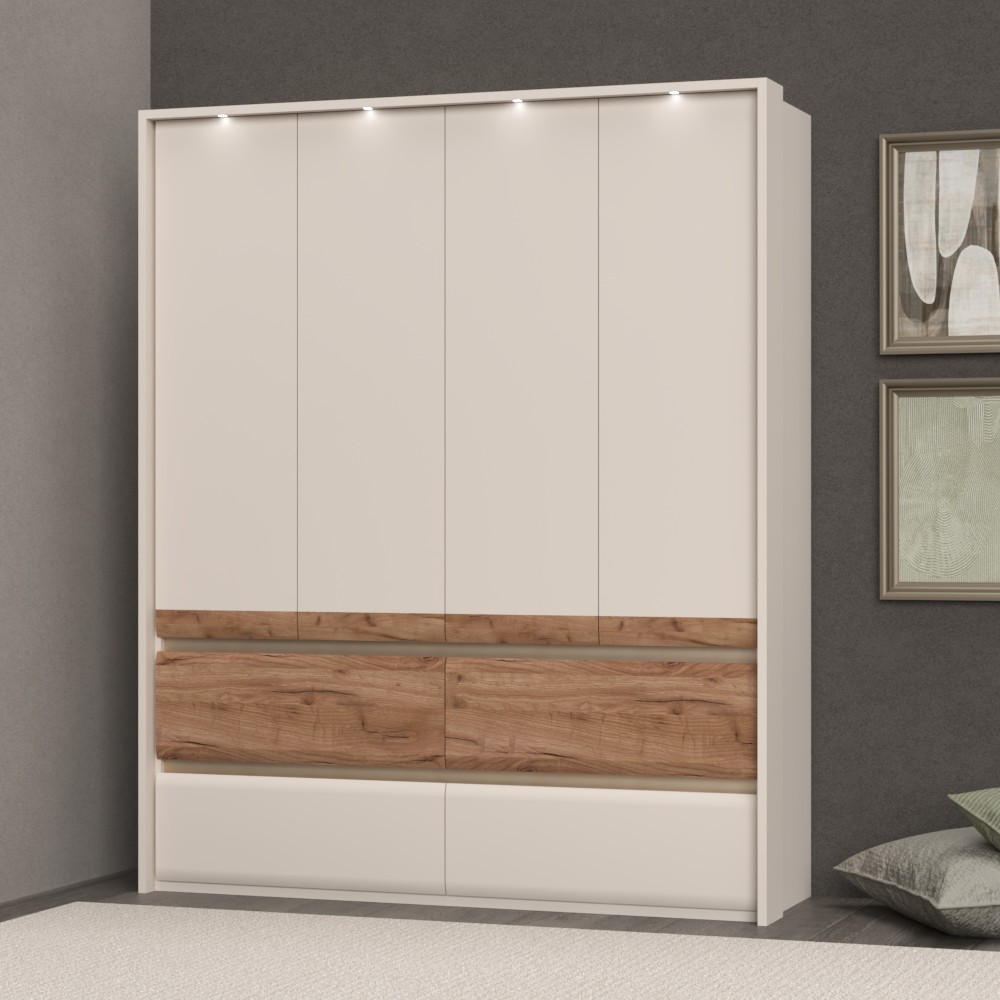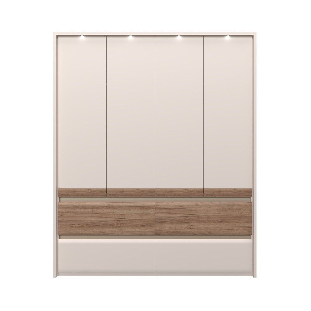 Ormar za spavaću sobu iz prestižne Invictus kolekcije sa četiri krila i četiri ladice sa skladnim i mekim frontama. Krila elementa su obostrano lakirana UV lakom s soft mat efektom u boji kašmira s aplikacijom od profiliranog medijapana u drvo-dekoru duhan hrast. Fronte ladica izrađene su od profilirane šperploče u dekoru hrasta duhana i kašmir mat boji. Unutarnji dijelovi korpusa su u toplom tekstilnom dekoru. Soft-close šarke i soft-close klizači s usporivačem omogućuju tiho zatvaranje krila i ladica što daje dodatnu udobnost pri stalnoj uporabi. Estetski izgled ormara upotpunjuju bočne i stropne letvice debljine 25 mm, te rasvjeta. Ukrasne lajsne, četiri LED svjetla i LED napajanje su uključeni u cijenu proizvoda. Uz pomoć ponuđene dodatne opreme imate mogućnost kreirati unutrašnjost ormara prema Vašim potrebama.