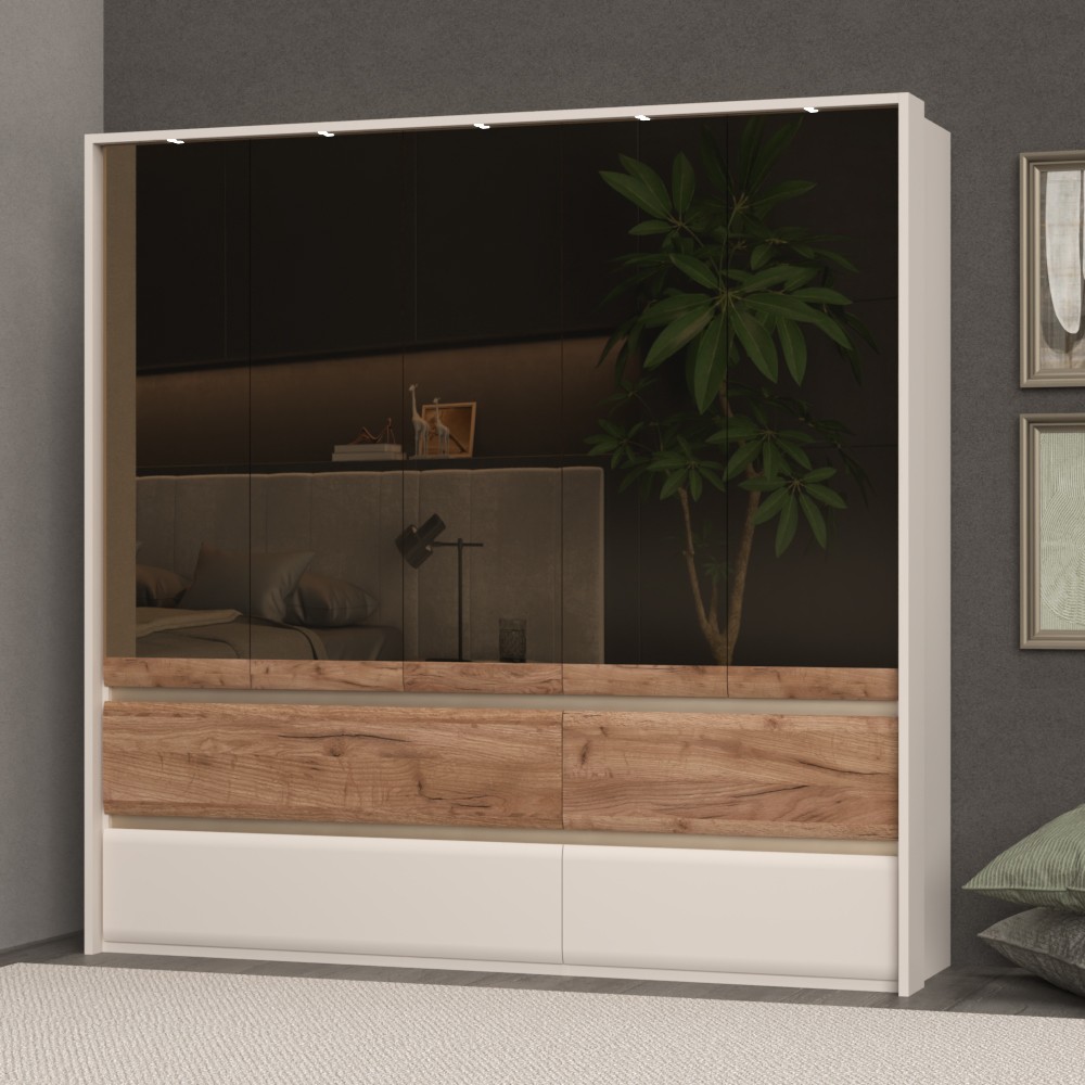 Ormar za spavaću sobu iz prestižne kolekcije Invictus s pet krila s ogledalima i četiri ladice sa skladnim i mekim frontama. Krila elementa u boji kašmira s ogledalom i profiliranom aplikacijom od medijapana u drvenom dekoru hrast duhan. Fronte ladica izrađene su od profilirane šperploče u dekoru hrasta duhana i kašmir mat boji. Unutarnji dijelovi kopusa su u toplom tekstilnom dekoru. Soft-close šarke i soft-close klizači s usporivačem omogućuju tiho zatvaranje krila i ladica što daje dodatnu udobnost pri stalnoj uporabi. Estetski izgled ormara upotpunjuju bočne i stropne letvice debljine 25 mm, te rasvjeta. Ukrasne lajsne, pet LED lampica i LED napajanje su uključeni u cijenu proizvoda. Uz pomoć ponuđene dodatne opreme imate mogućnost kreirati unutrašnjost ormara prema Vašim potrebama.