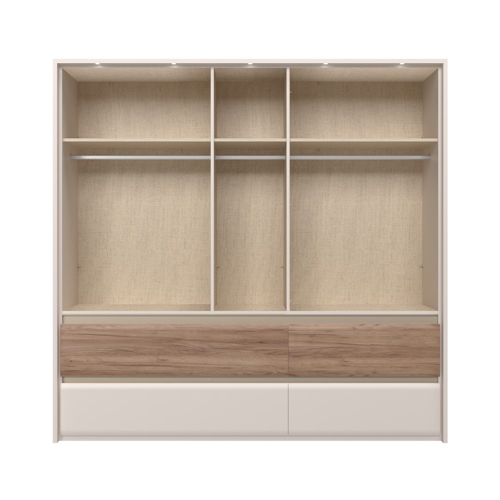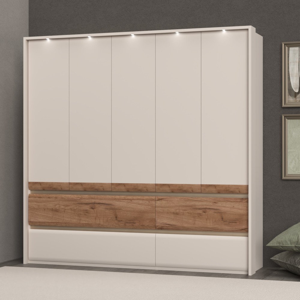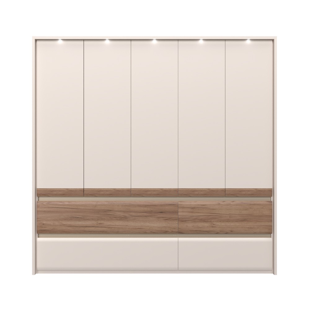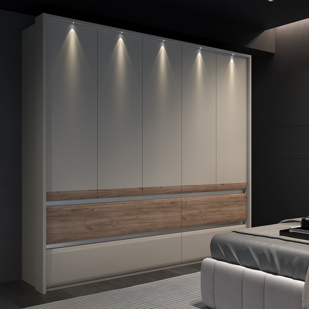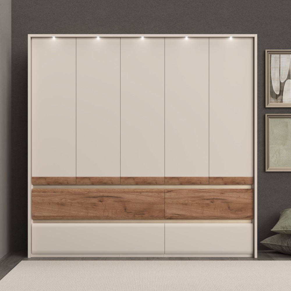 Ormar za spavaću sobu iz prestižne Invictus kolekcije sa pet krila i četiri ladice sa skladnim i mekim frontama. Krila elementa su obostrano lakirana UV lakom s soft mat efektom u boji kašmira s aplikacijom od profiliranog medijapana u drvo-dekoru duhan hrast. Fronte ladica izrađene su od profilirane šperploče u dekoru hrasta duhana i kašmir mat boji. Unutarnji dijelovi korpusa su u toplom tekstilnom dekoru. Soft-close šarke i soft-close klizači s usporivačem omogućuju tiho zatvaranje krila i ladica što daje dodatnu udobnost pri stalnoj uporabi. Estetski izgled ormara upotpunjuju bočne i stropne letvice debljine 25 mm, te rasvjeta. Ukrasne lajsne, pet LED lampica i LED napajanje su uključeni u cijenu proizvoda. Uz pomoć ponuđene dodatne opreme imate mogućnost kreirati unutrašnjost ormara prema Vašim potrebama.