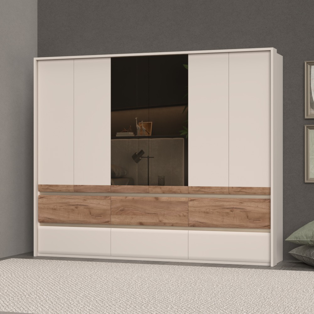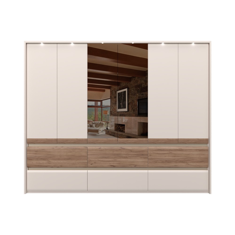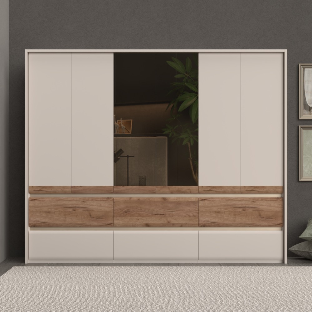 Ormar za spavaću sobu iz prestižne kolekcije Invictus sa šest krila od kojih dva imaju ogledala i šest ladica sa skladnim i mekim frontama. Krila elementa u boji kašmira s ogledalom i profiliranom aplikacijom od medijapana u drvenom dekoru hrast duhan. Fronte ladica izrađene su od profilirane šperploče u dekoru hrasta duhana i kašmir mat boji. Unutarnji dijelovi tijela su u toplom tekstilnom dekoru. Soft-close šarke i soft-close klizači s usporivačem omogućuju tiho zatvaranje krila i ladica što daje dodatnu udobnost pri stalnoj uporabi. Estetski izgled ormara upotpunjuju bočne i stropne letvice debljine 25 mm, te rasvjeta. Ukrasne lajsne, šest LED lampica i LED napajanje su uključeni u cijenu proizvoda. Uz pomoć ponuđene dodatne opreme imate mogućnost kreirati unutrašnjost ormara prema Vašim potrebama.