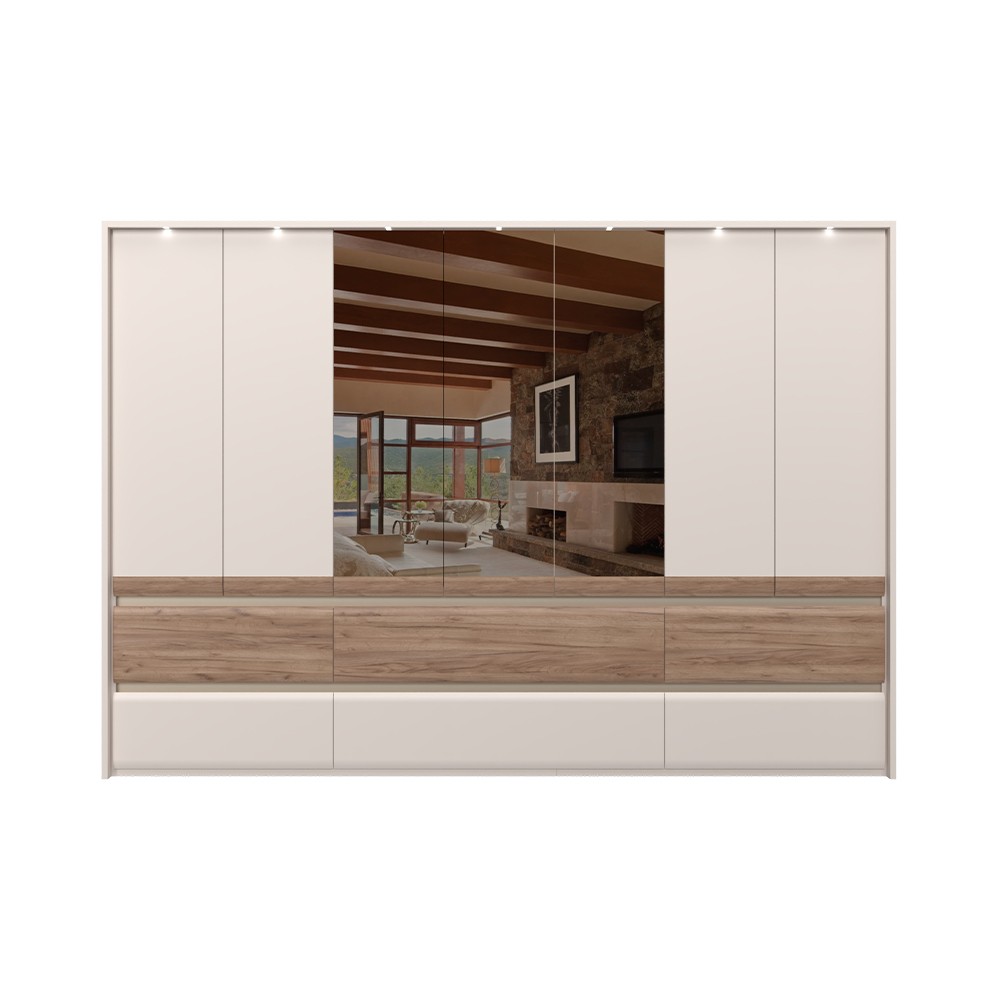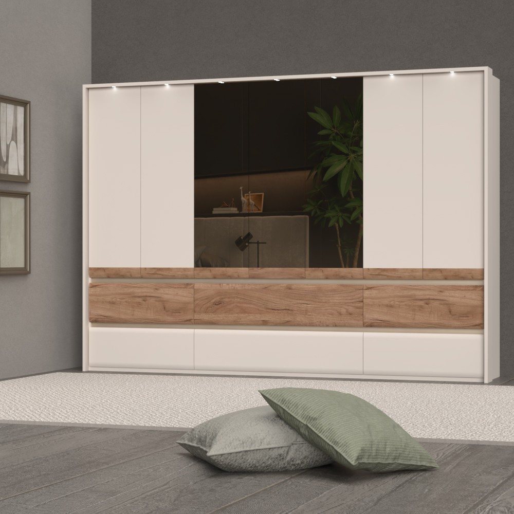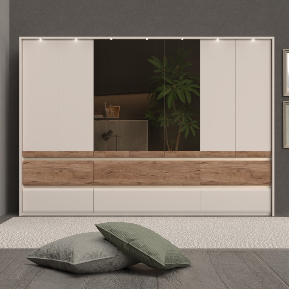 Ormar za spavaću sobu iz prestižne kolekcije Invictus sa sedam krila od kojih su tri ogledala i šest ladica skladnih i mekanih fronti. Krila elementa u boji kašmira s ogledalom i profiliranom aplikacijom od medijapana u drvenom dekoru hrast duhan. Fronte ladica izrađene su od profilirane šperploče u dekoru hrasta duhana i kašmir mat boji. Unutarnji dijelovi korpusa su u toplom tekstilnom dekoru. Soft-close šarke i soft-close klizači s usporivačem omogućuju tiho zatvaranje krila i ladica što daje dodatnu udobnost pri stalnoj uporabi. Estetski izgled ormara upotpunjuju bočne i stropne letvice debljine 25 mm, te rasvjeta. Ukrasne lajsne, sedam LED lampica i LED napajanje su uključeni u cijenu proizvoda. Uz pomoć ponuđene dodatne opreme imate mogućnost kreirati unutrašnjost ormara prema Vašim potrebama.