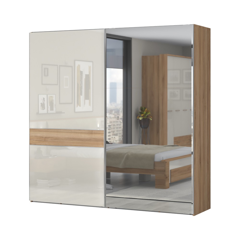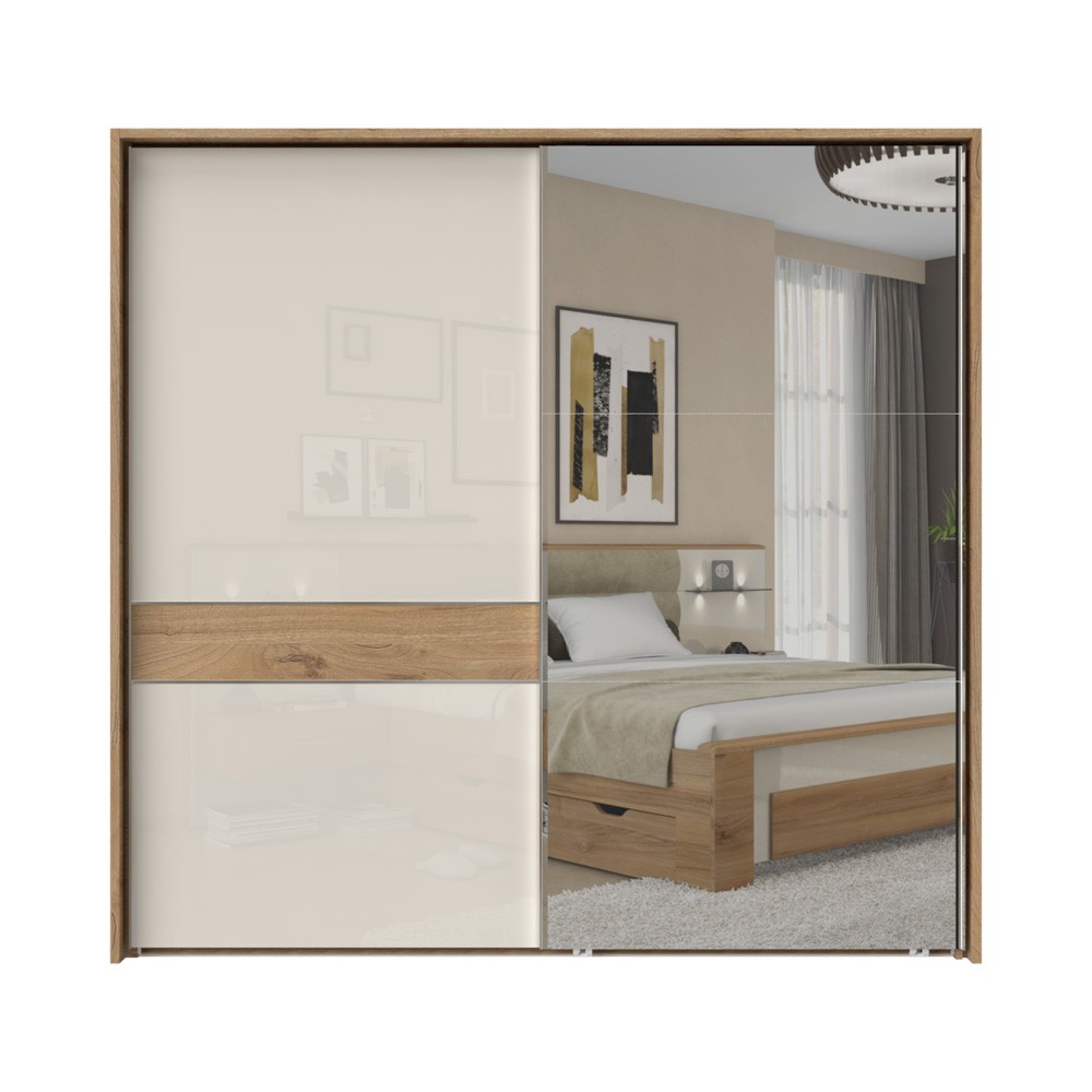 Klizni ormar za spavaću sobu, iz kolekcije Gala, snažne geometrijske forme sa dva krila od kojih jedno ima aplikaciju u drvenom dekoru, a drugo je prekriveno ogledalom. Fronta kliznog ormara je lakirana UV lakom u visokom sjaju u bež boji s aplikacijom u drvnom dekoru pacifik orah. Korpus elementa izrađen je od šperploče u dekoru pacifik orah. Unutarnji dijelovi korpusa su bijeli, soft-close mehanizam omogućuje tiho zatvaranje krila, što pruža dodatnu udobnost tijekom stalne uporabe. Klizni ormar sadrži šest srednjih i šest manjih polica, ormar sadrži dvije srednje i dvije manje garderobne šipke, te podesive nogice koje omogućuju niveliranje na neravnim površinama. Dodatna oprema pruža mogućnost kreiranja unutrašnjosti ormara prema vašim potrebama.