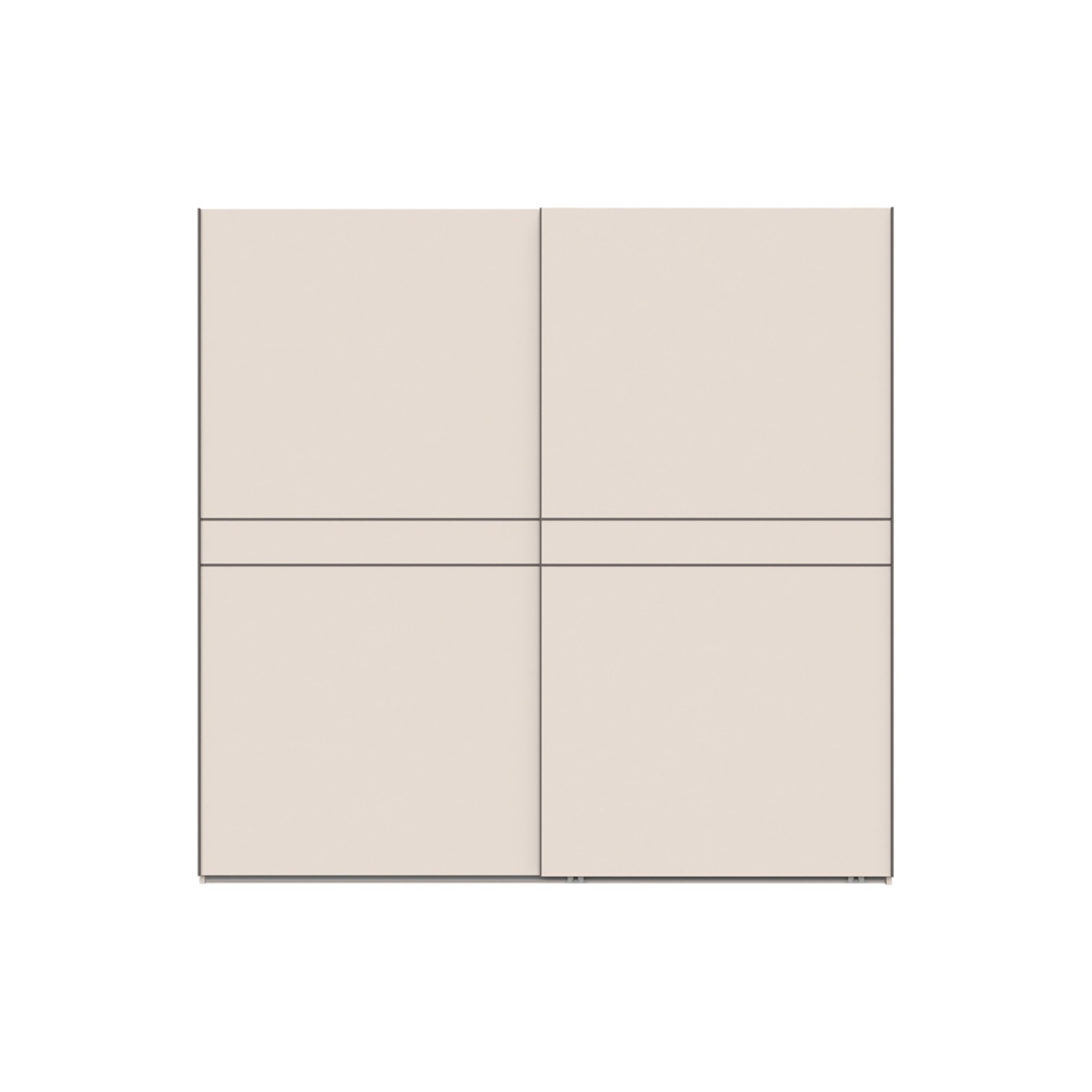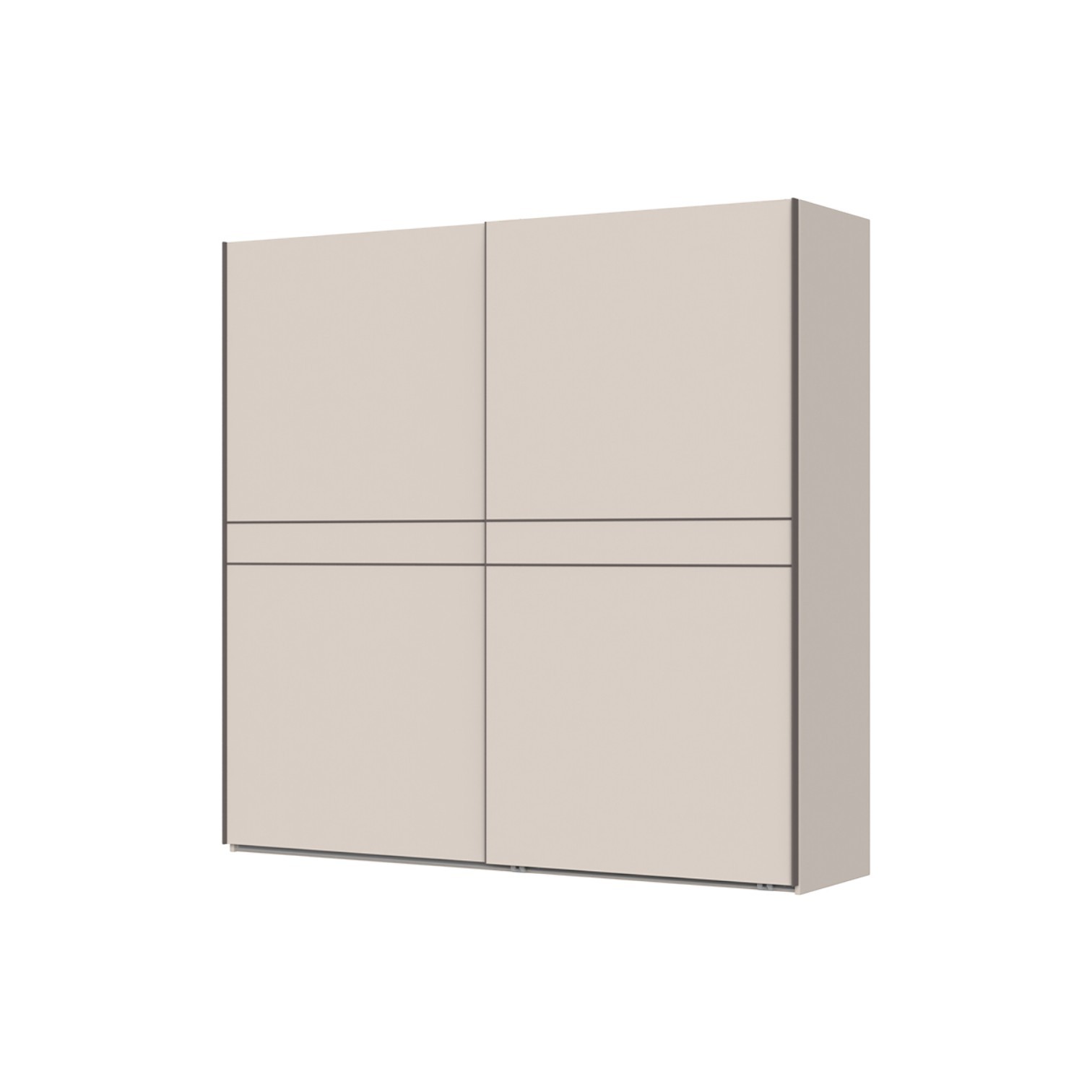 Dvostruki klizni ormar iz kolekcije Opera, 2 krila lakirana soft mat UV lakom u boji kašmira, stranice lakirane soft mat UV lakom u boji kašmira. Unutrašnjost u textil dekoru, 6 srednjih i 6 manjih polica, 4 šipke za garderobu, nivelirajuće nogice, ručke u boji cortado smeđa mat.