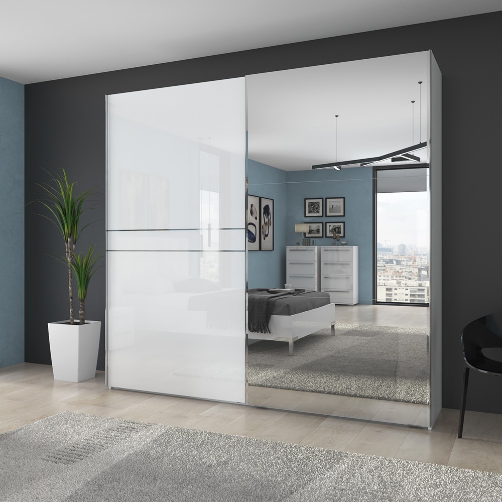 Dvokrilni klizni ormar s ogledalom na jednom krilu, dizajniran u geometrijskim oblicima iz kolekcije namještaja Piano. Fronte i stranice ormara lakirane su UV lakom u visokom sjaju, u toploj bež ili kristalno bijeloj boji u kombinaciji s elegantnim horizontalnim kromiranim letvicama integrirana ručka od elegantnog kromiranog profila duž cijelog krila ormara. Unutarnji dijelovi korpusa su bijeli, četiri okomita segmenta za pohranu, soft-close mehanizam omogućuje tiho zatvaranje krila, što pruža dodatnu udobnost tijekom stalne uporabe. Dodatnom opremom možete kreirati unutrašnjost ormara prema svojim potrebama. Prostran i funkcionalan ormar koji svojom veličinom može pronaći mjesto u svakoj spavaćoj sobi.