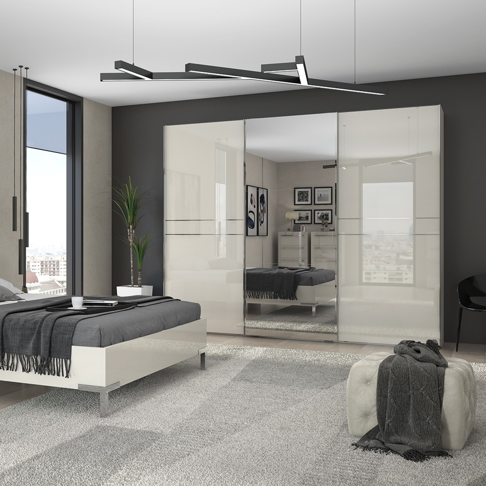 Trokrilni klizni ormar s ogledalom na jednom krilu, dizajniran u geometrijskim oblicima iz kolekcije namještaja Piano. Fronte i stranice ormara lakirane su UV lakom u visokom sjaju, u toploj bež ili kristalno bijeloj boji u kombinaciji s elegantnim horizontalnim kromiranim letvicama, integrirana ručka od elegantnog kromiranog profila duž cijelog krila ormara. Unutarnji dijelovi korpusa su bijeli. Tri okomita segmenta za pohranu. Mehanizam soft-close omogućuje tiho zatvaranje krila, što pruža dodatnu udobnost tijekom stalne uporabe. Dodatnom opremom možete kreirati unutrašnjost ormara prema svojim potrebama. Prostran i funkcionalan ormar koji svojom veličinom može pronaći mjesto u svakoj spavaćoj sobi.