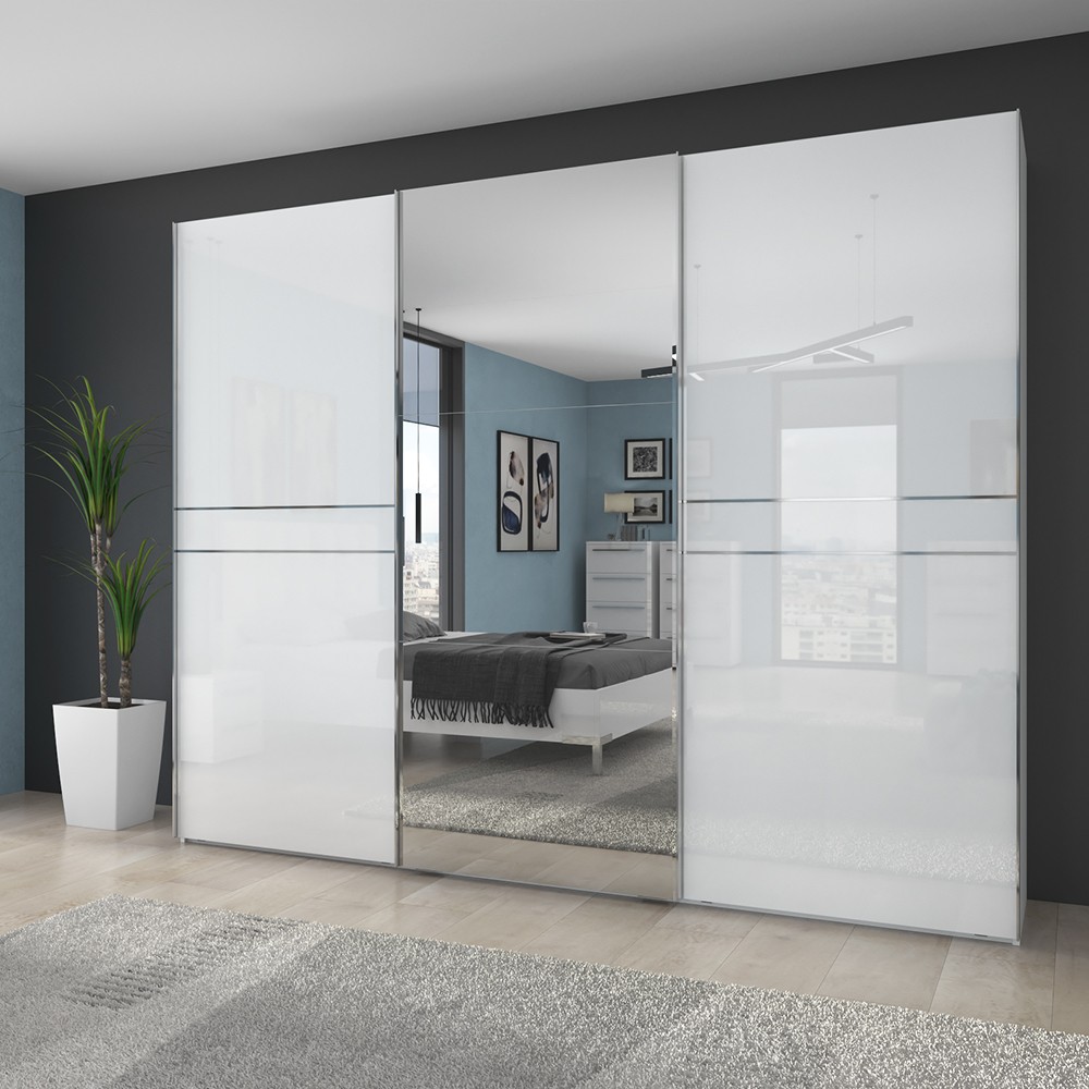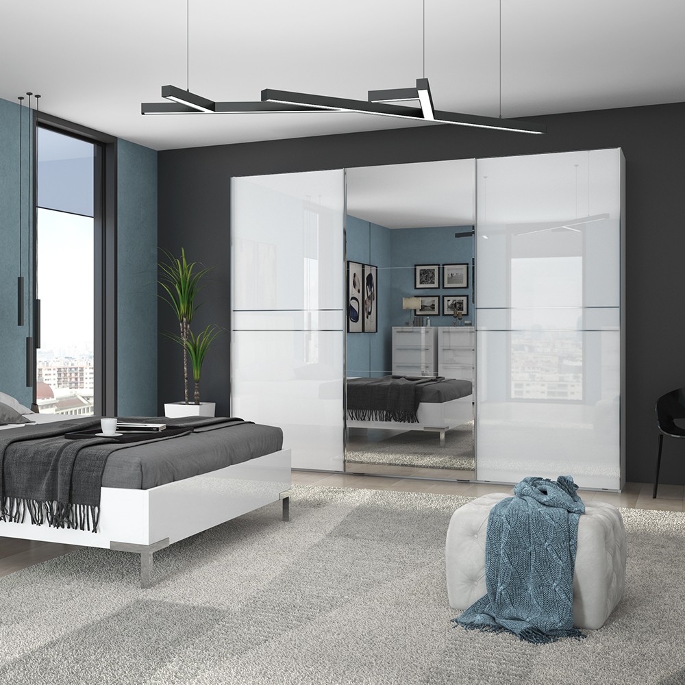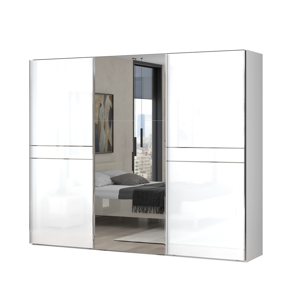 Trokrilni klizni ormar s ogledalom na jednom krilu, dizajniran u geometrijskim oblicima iz kolekcije namještaja Piano. Fronte i stranice ormara lakirane su UV lakom u visokom sjaju, u toploj bež ili kristalno bijeloj boji u kombinaciji s elegantnim horizontalnim kromiranim letvicama, integrirana ručka od elegantnog kromiranog profila duž cijelog krila ormara. Unutarnji dijelovi korpusa su bijeli. Tri okomita segmenta za pohranu. Mehanizam soft-close omogućuje tiho zatvaranje krila, što pruža dodatnu udobnost tijekom stalne uporabe. Dodatnom opremom možete kreirati unutrašnjost ormara prema svojim potrebama. Prostran i funkcionalan ormar koji svojom veličinom može pronaći mjesto u svakoj spavaćoj sobi.