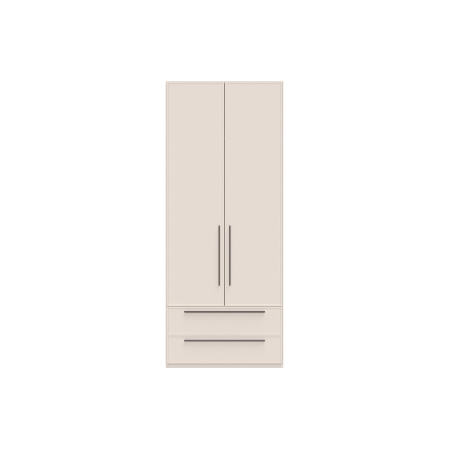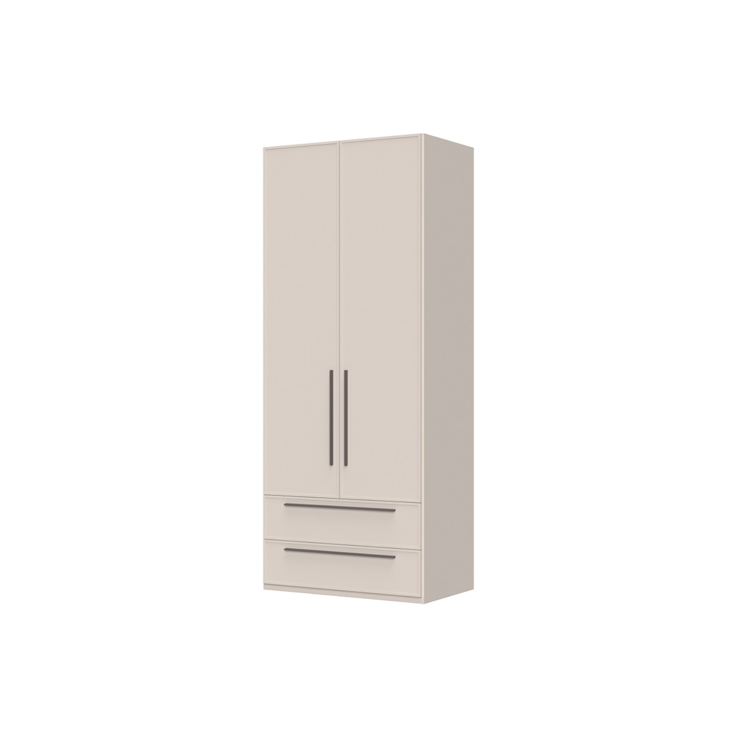 Funkcionalni ormar iz kolekcije Opera. Može se kombinirati s dodatnim ormarima. Korpus i fronte lakirani soft mat UV lakom u boji kašmira, unutrašnjost u textil dekoru, fronta s ukrasnim profiliranim MDF okvirom, 2 krila i dvije ladice soft mat UV lak, 1 polica i 1 garderoberna šipka, nivelirajuće nogice, ručke u boji cortado smeđa mat.