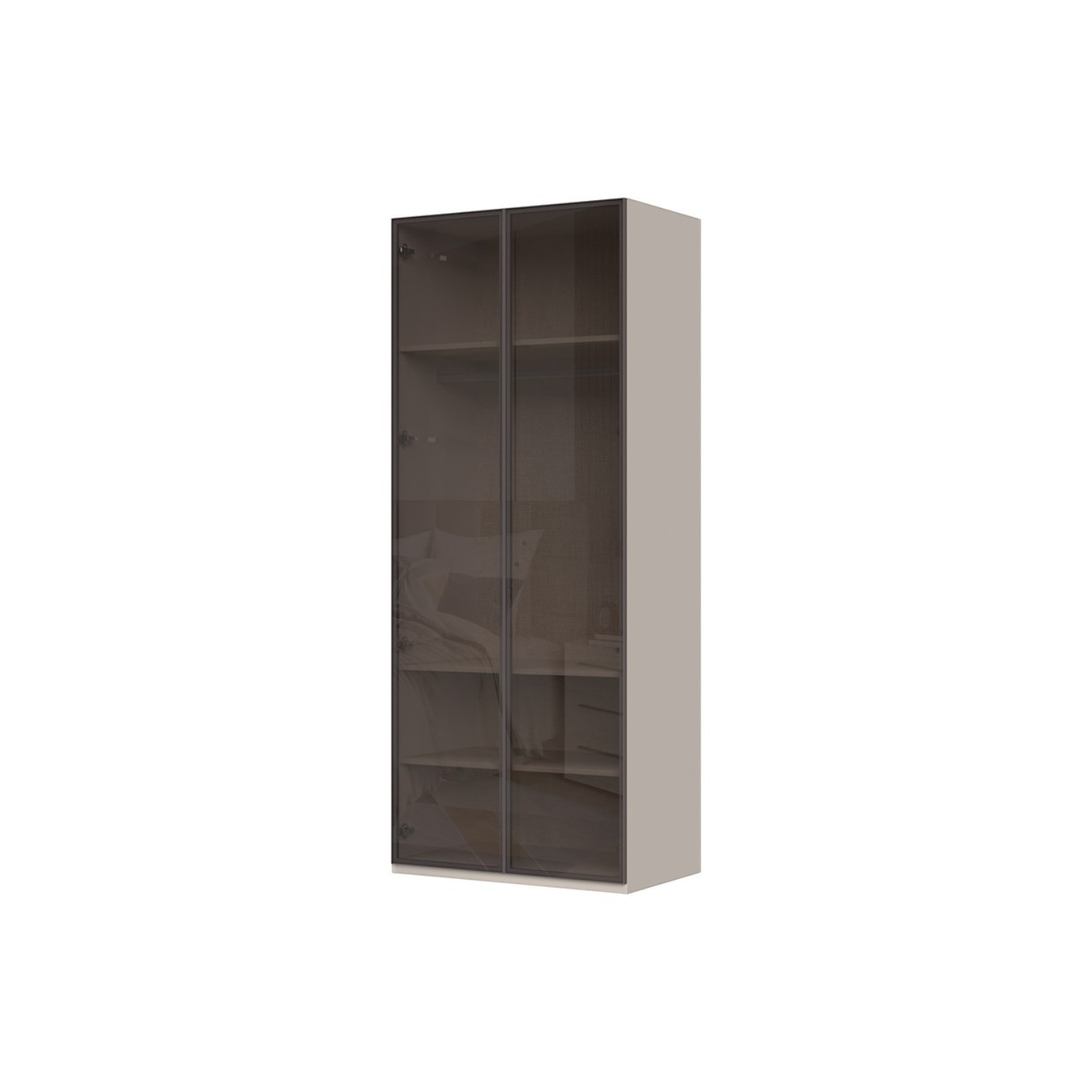 Funkcionalni dvokrilni ormar sa staklenim frontama i aluminijskim okvirom iz kolekcije Opera. Kombinira se s dodatnim ormarima staklene fronte s aluminijskim okvirom. Unutrašnjost u textil dekoru, stranice lakirane soft mat UV lakom u boji kašmira. Unutarnja rasvjeta ormarića (16W), integrirasano u police i strop (jedna polica 4W), 3 police i 1 garderoberna šipka, nivelirajuće nogice.