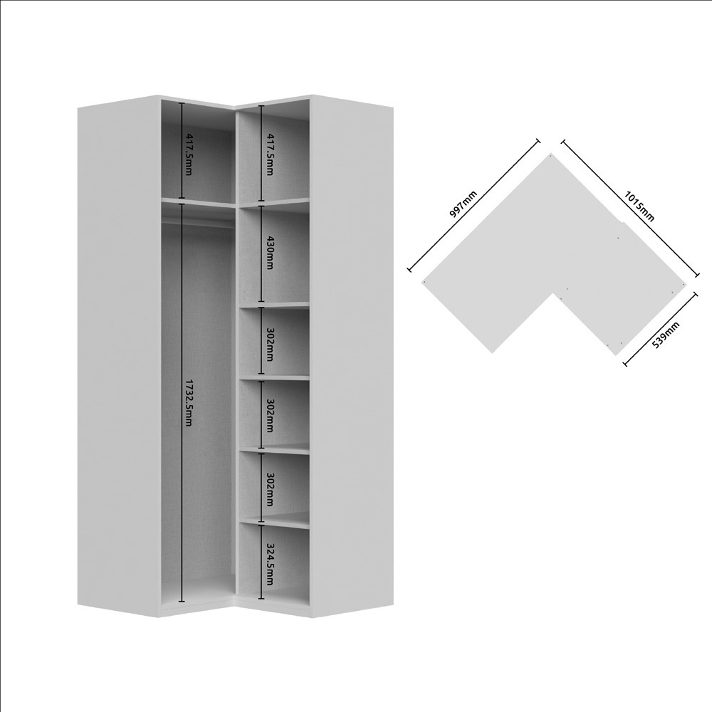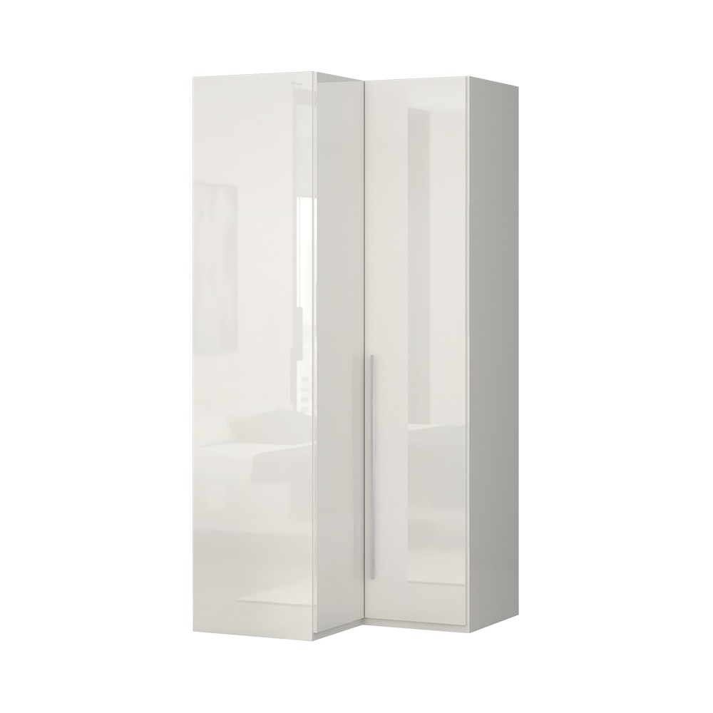Funkcionalni dvokrilni kutni ormar geometrijskog dizajna. Fronte i stranice ormara su lakirane UV lakom u visokom sjaju, u toploj bež ili kristalno bijeloj boji. Unutarnji dijelovi korpusa su bijele boje. Soft-close šarke omogućuju tiho zatvaranje krila, što pruža dodatnu udobnost tijekom stalne uporabe. Istaknite estetski izgled ormara s bočnim i stropnim letvicama, u istoj boji i sjaju, debljine 25 mm. Dodatnom opremom možete kreirati unutrašnjost ormara prema svojim potrebama. Spoj lijepog i jednostavnog u ormaru u kojem su sve stvari uredno posložene.