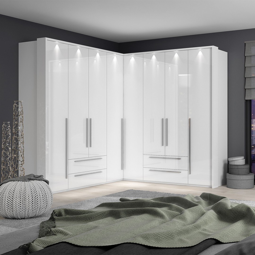 Funkcionalni dvokrilni kutni ormar geometrijskog dizajna. Fronte i stranice ormara su lakirane UV lakom u visokom sjaju, u toploj bež ili kristalno bijeloj boji. Unutarnji dijelovi korpusa su bijele boje. Soft-close šarke omogućuju tiho zatvaranje krila, što pruža dodatnu udobnost tijekom stalne uporabe. Istaknite estetski izgled ormara s bočnim i stropnim letvicama, u istoj boji i sjaju, debljine 25 mm. Dodatnom opremom možete kreirati unutrašnjost ormara prema svojim potrebama. Spoj lijepog i jednostavnog u ormaru u kojem su sve stvari uredno posložene.