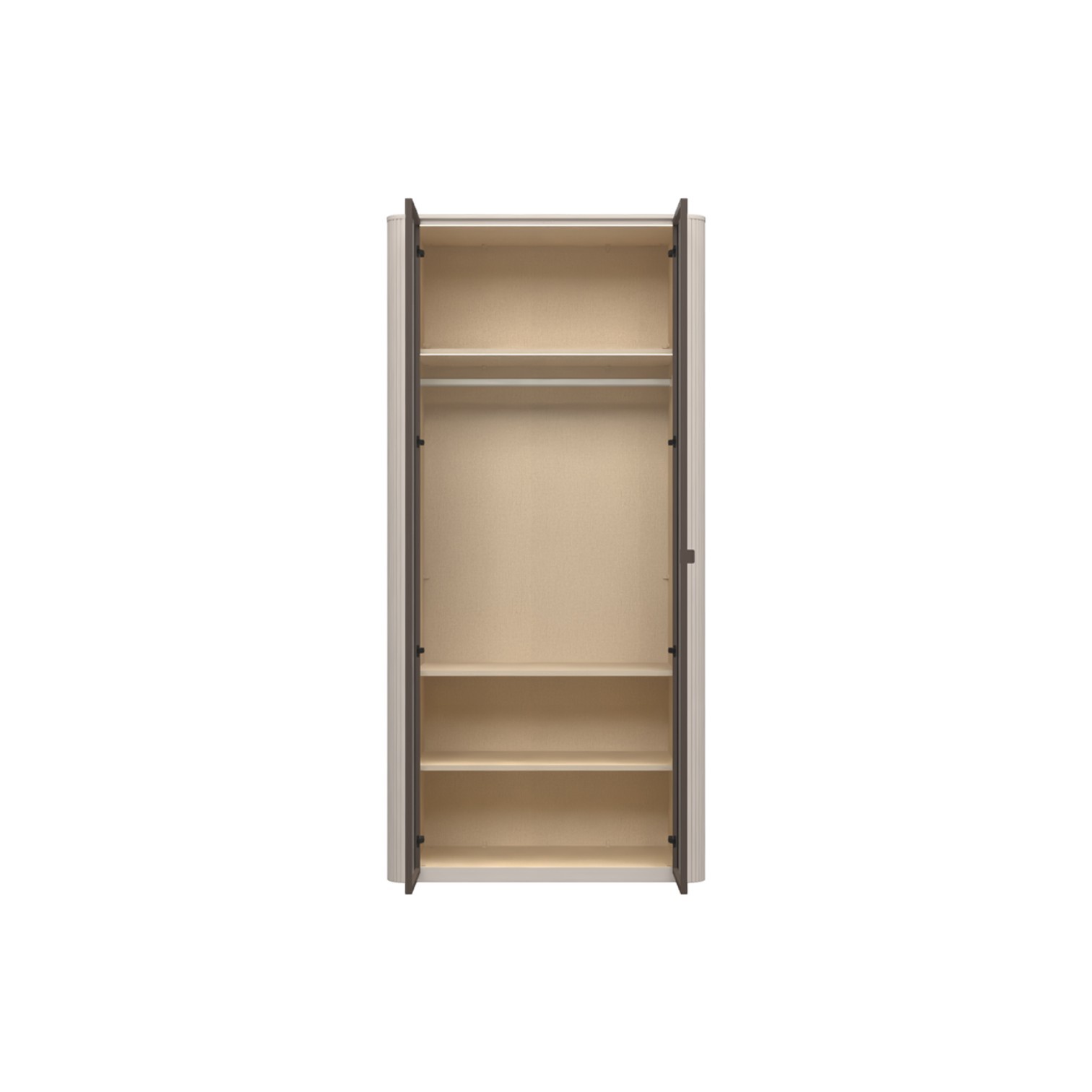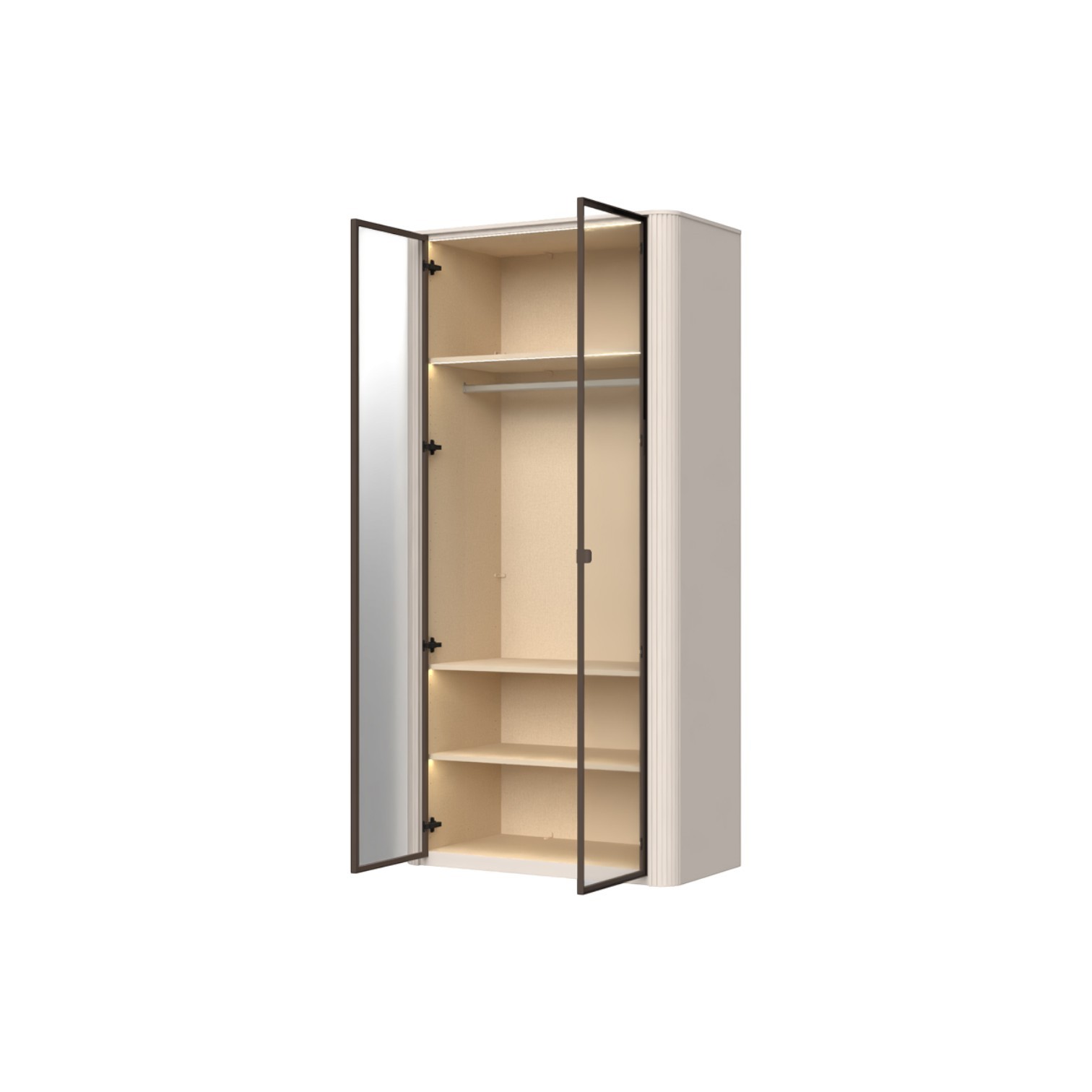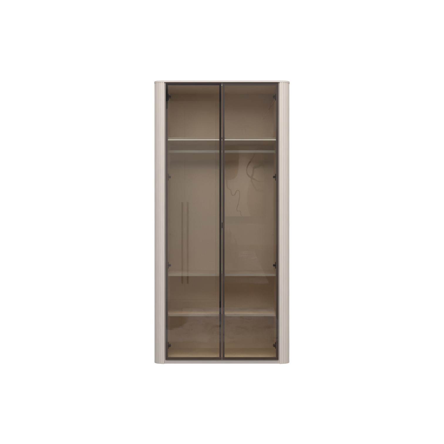 Funkcionalni dvokrilni ormar sa staklenim frontama i aluminijskim okvirom u dekoru Midnight Copper. Obostrano lakiran soft mat UV lakom u kašmir dekoru, ukrasni stup i stropna letvica u kašmir mat lak dekoru, unutrašnjost u Textil dekoru. LED rasvjeta na stropu i u policama 16,9W SPL6 1kom., 3 velike police sa rasvjetom, 1 garderobna šipka, nivelirajuće nogice i  metalna ručka u dekoru Midnight Copper.