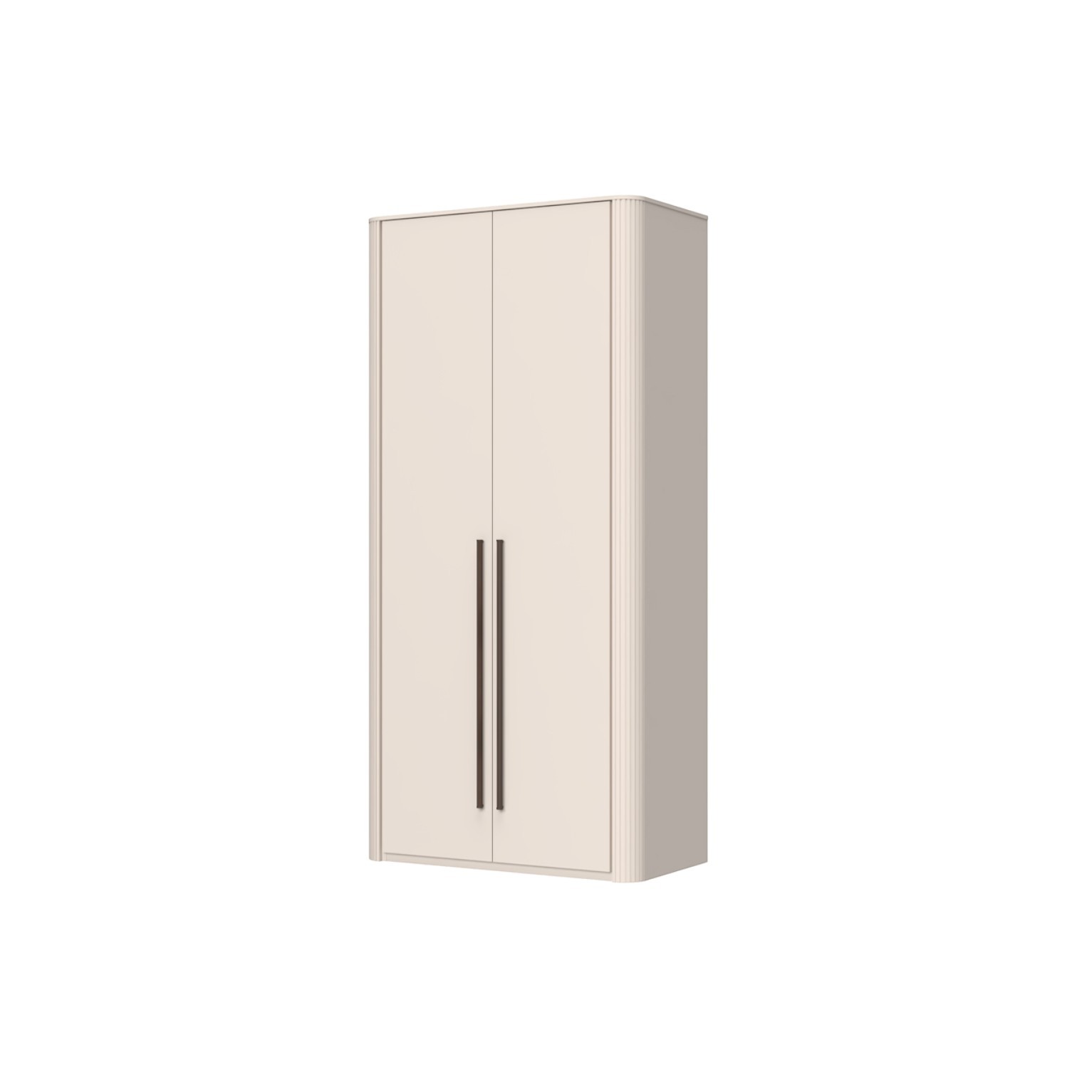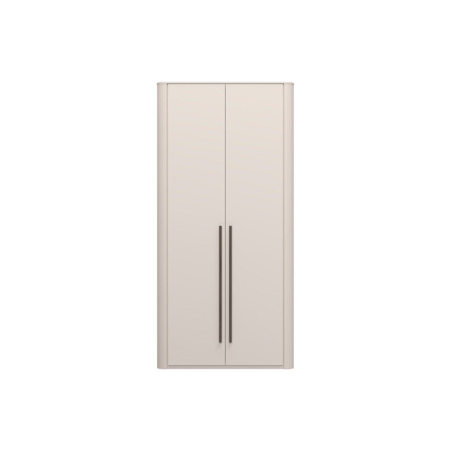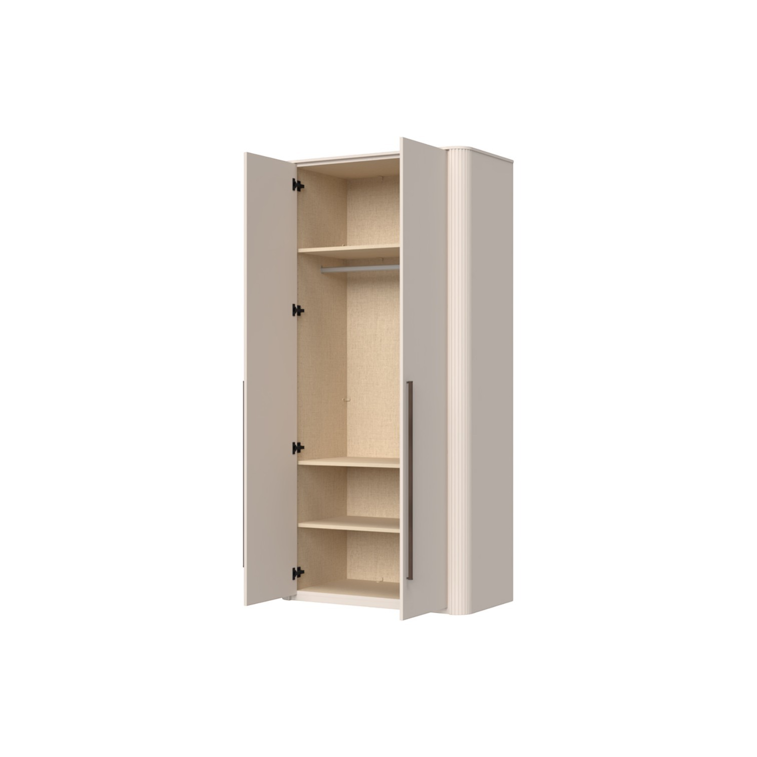 Funkcionalni dvokrilni ormar lakiran UV soft matt lakom u kašmir dekoru. Obostrano lakiran soft mat UV lakom u kašmir dekoru, ukrasni stup i stropna letvica u kašmir mat lak dekoru, unutrašnjost u textil dekoru, 3 glavne police, 1 garderobna šipka, nivelirajuće nogice, ručka metal-koža, dekor Midnight Copper.